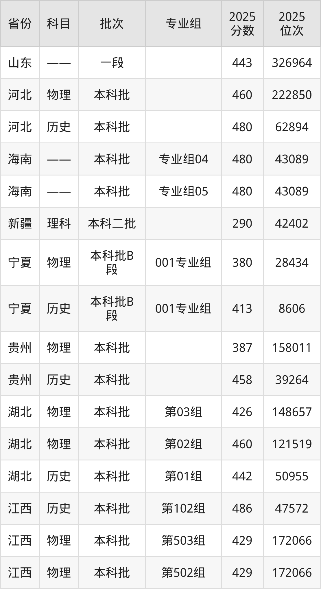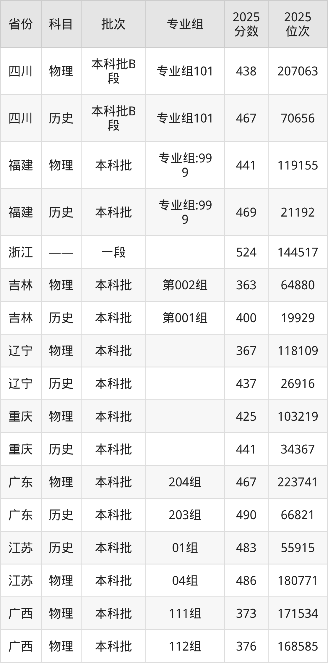 2025年投档录取最低分为458分,录取最低位次为39264名。