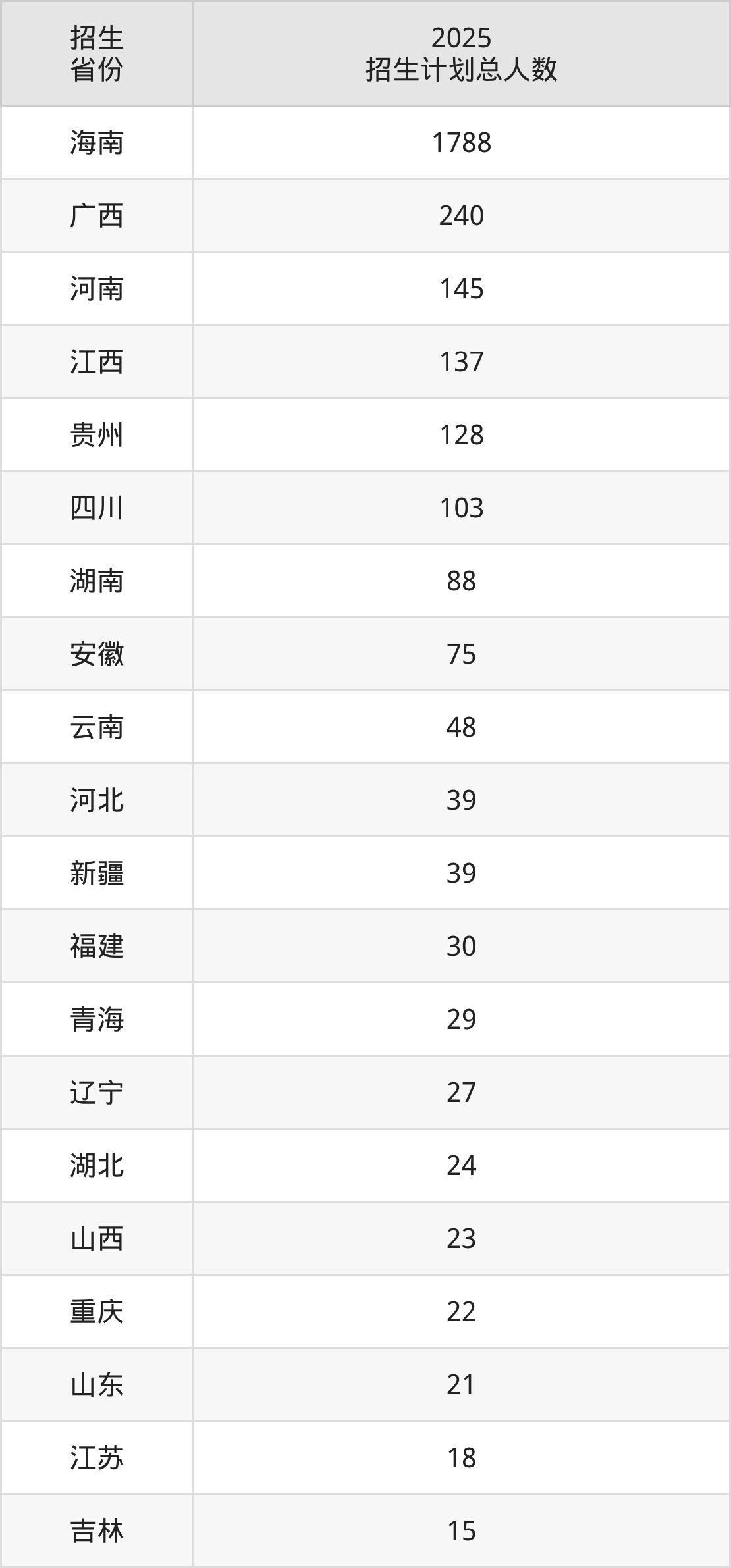 2025年海南科技职业大学面向全国26个省市开展本科招生;招生专业共24个,招生人数共3096人。2025年在海南省招生计划总人数是1788人,其中,海南科技职业大学在海南省招生人数最多的是护理。海南科技职业大学在各省具体招生人数情况如下表。