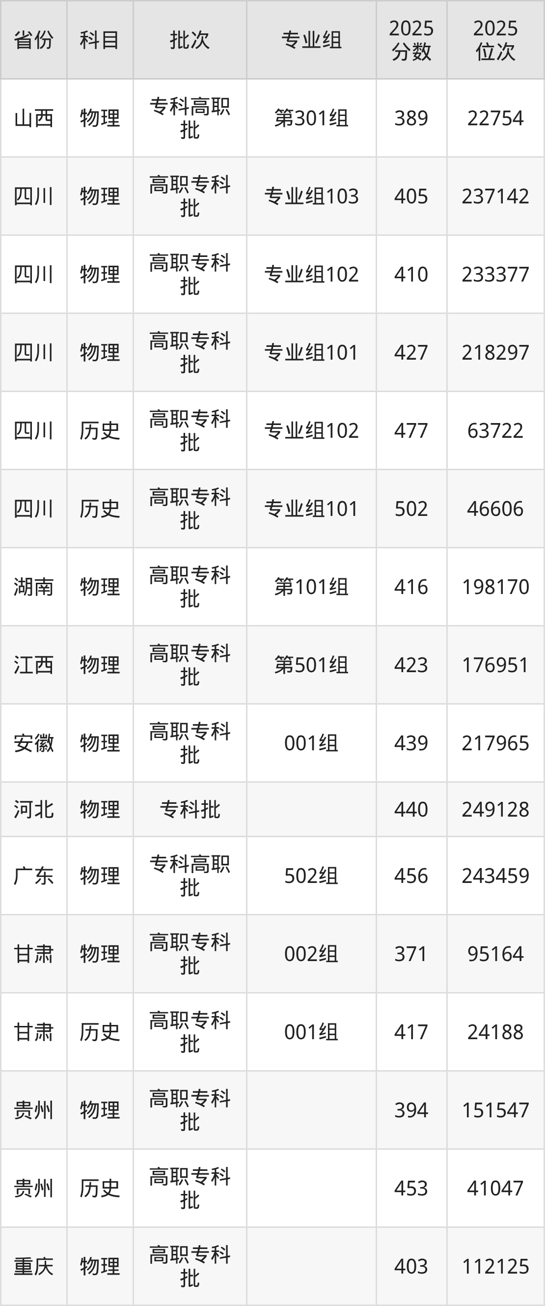 2025年在专科物理类进行招生,各专业组分数线详情如下: