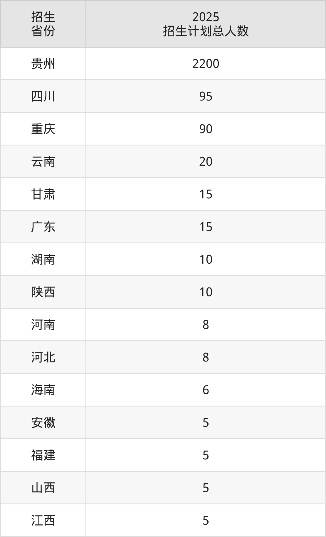 2025年遵义医药高等专科学校面向全国15个省市开展专科招生;招生专业共18个,招生人数共2497人。2025年在贵州省招生计划总人数是2200人,其中,遵义医药高等专科学校在贵州省招生人数最多的是中医学。遵义医药高等专科学校在各省具体招生人数情况如下表。