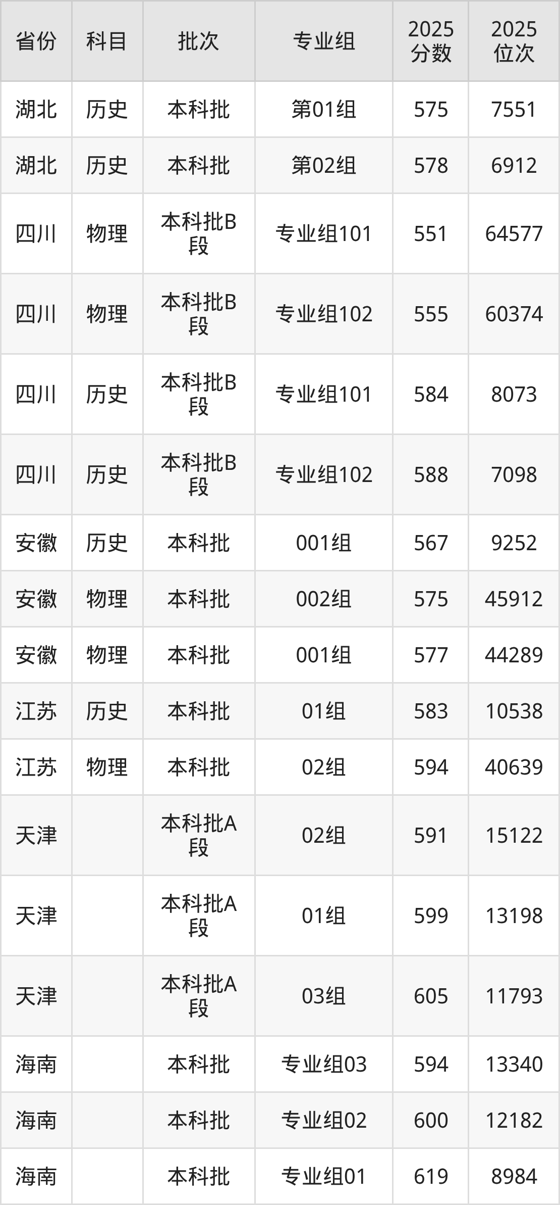 2025年在本科物理类进行招生,各专业组分数线详情如下:
