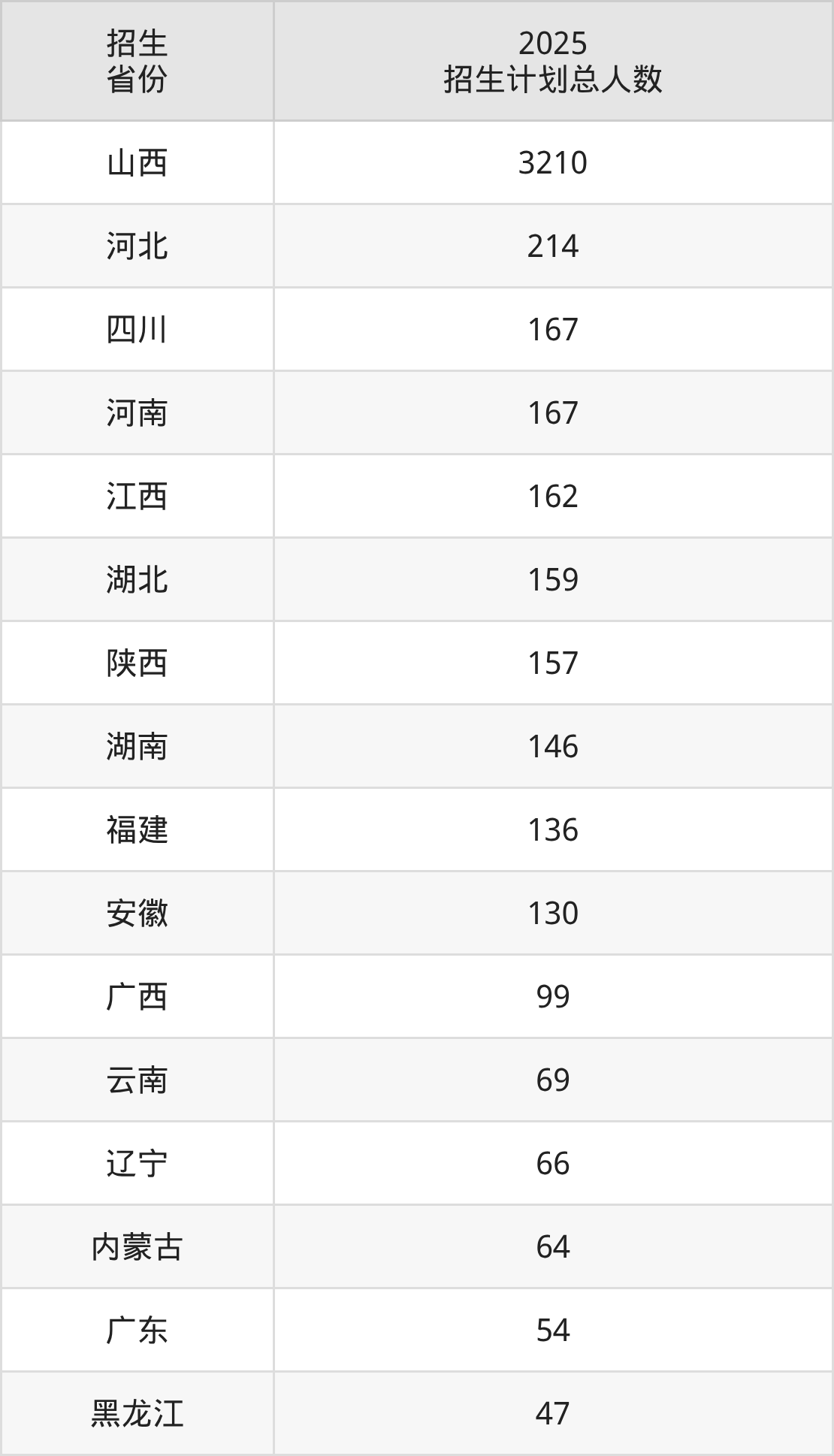 2025年山西大学面向全国28个省市开展本科招生;招生专业共55个,招生人数共5301人。2025年在山西省招生计划总人数是3210人,其中,山西大学在山西省招生人数最多的是软件工程。山西大学在各省具体招生人数情况如下表。