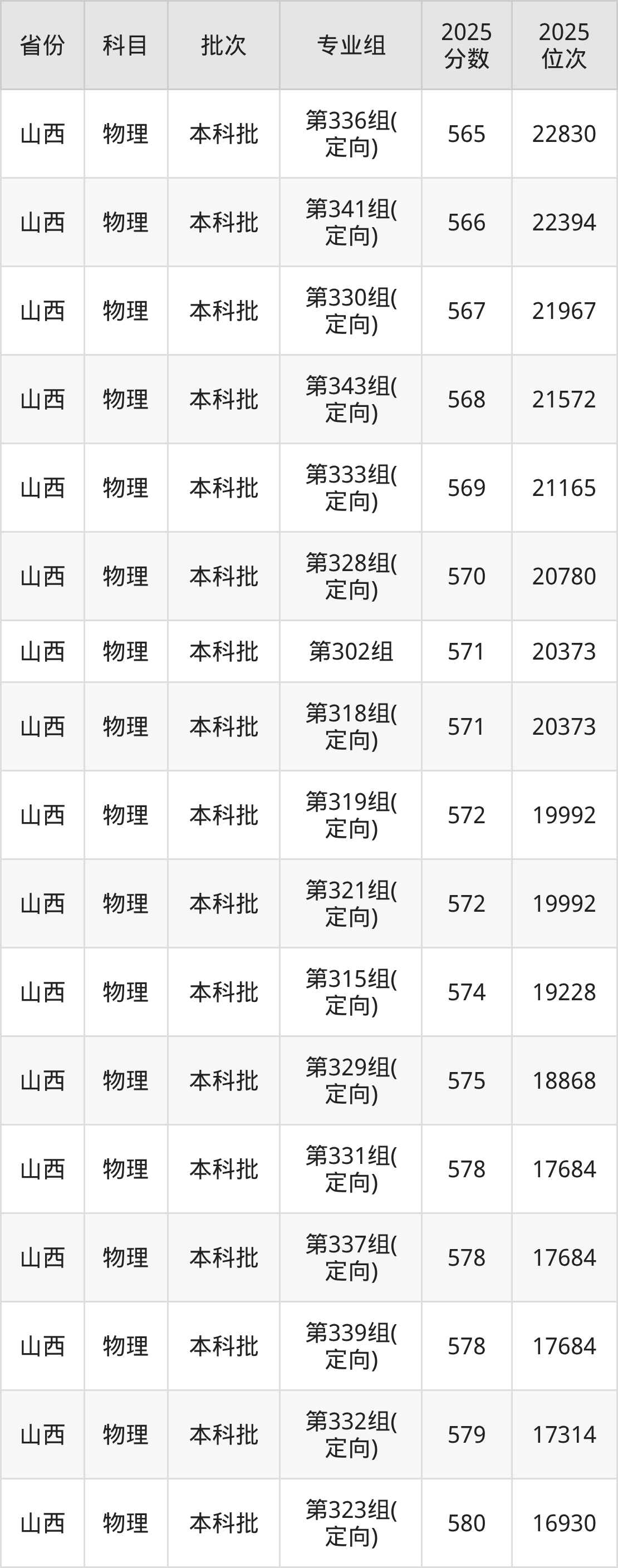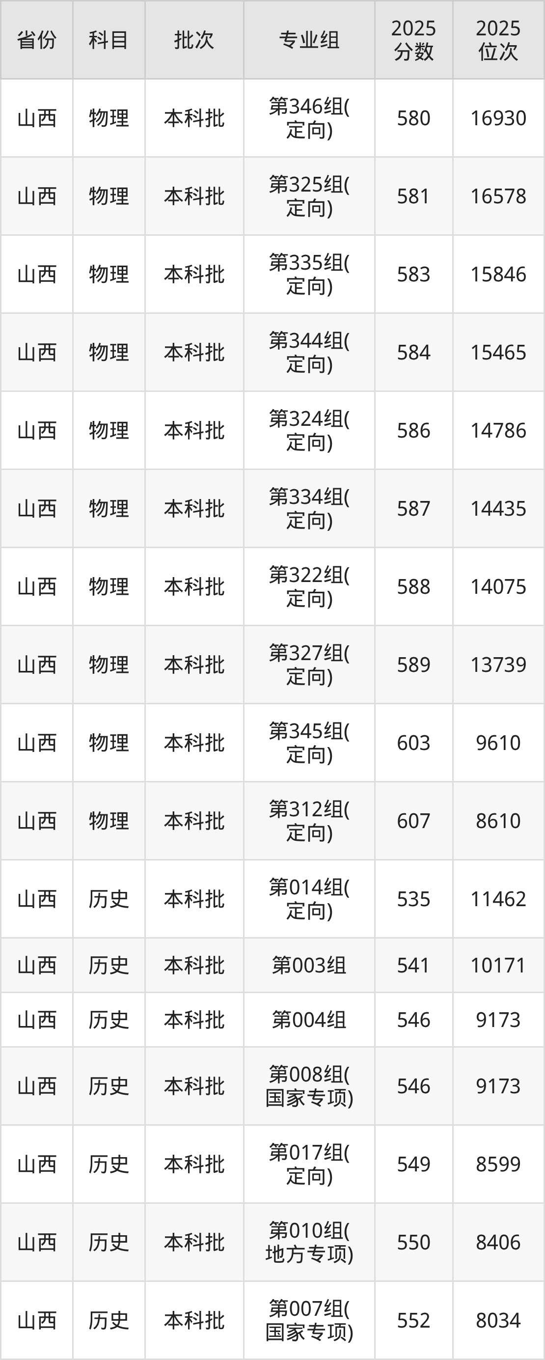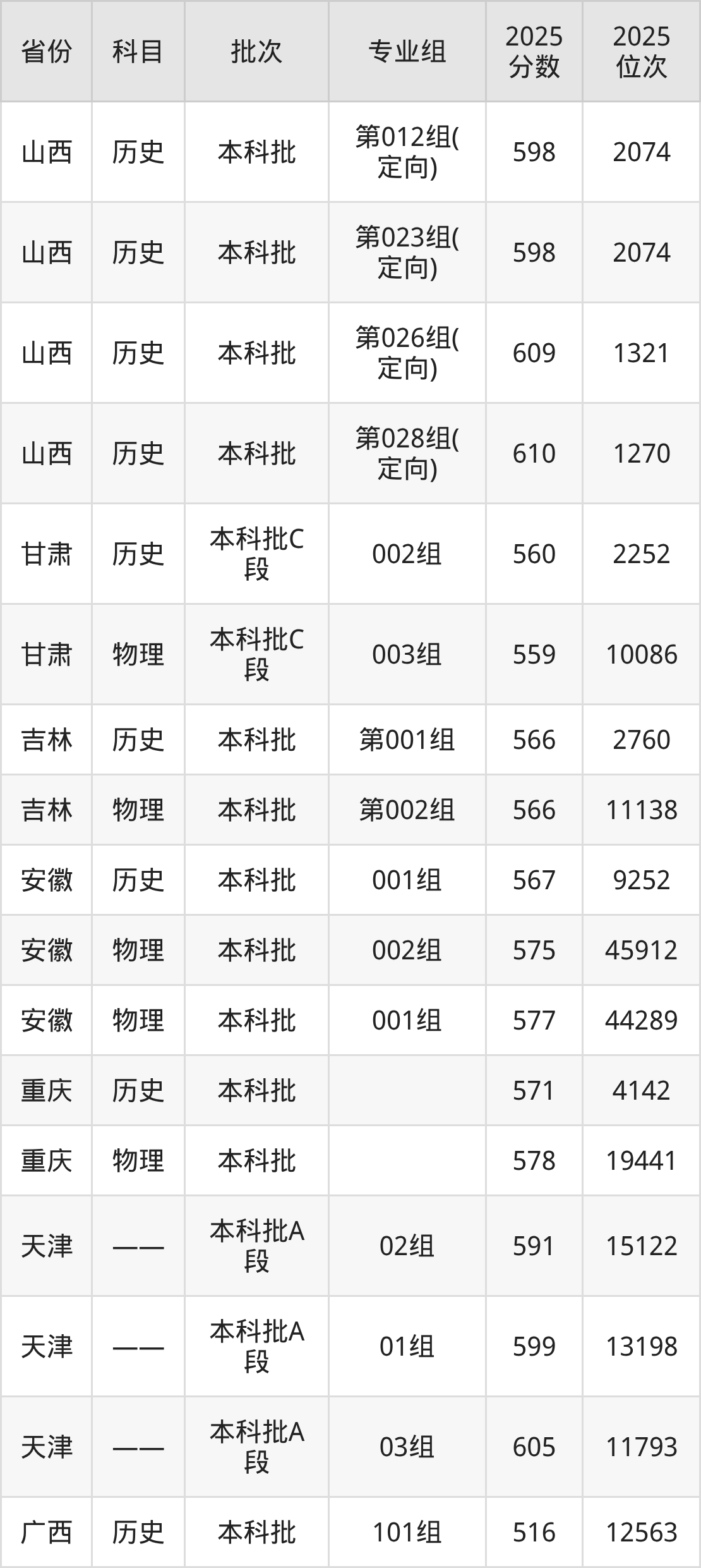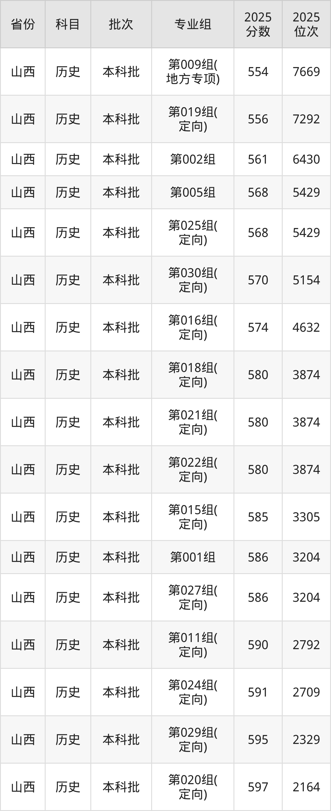山西大学第019组(定向):2025年投档录取最低分为556分,录取最低位次为7292名。
