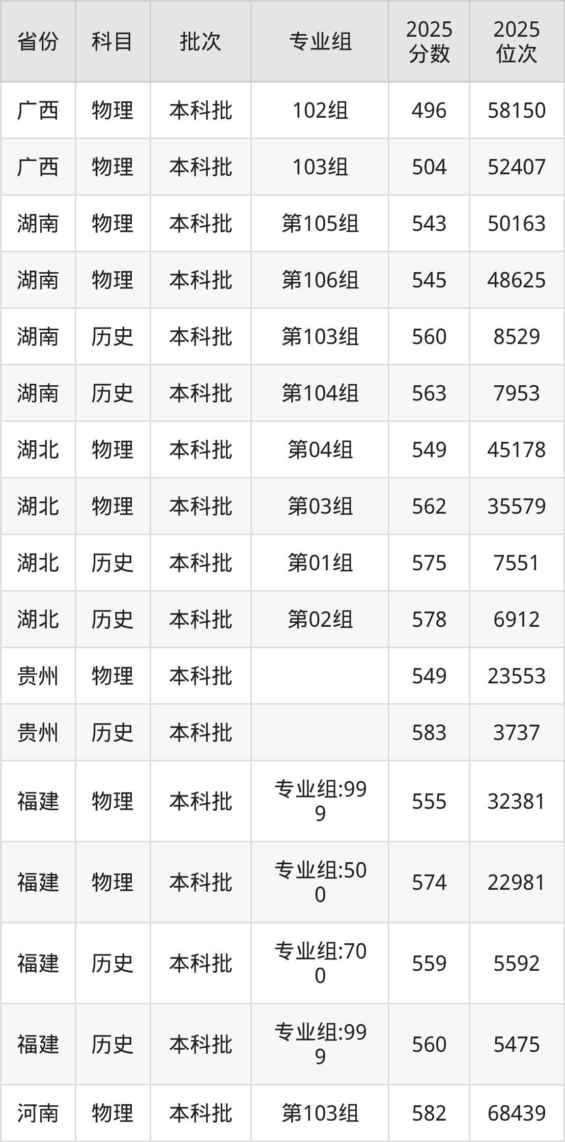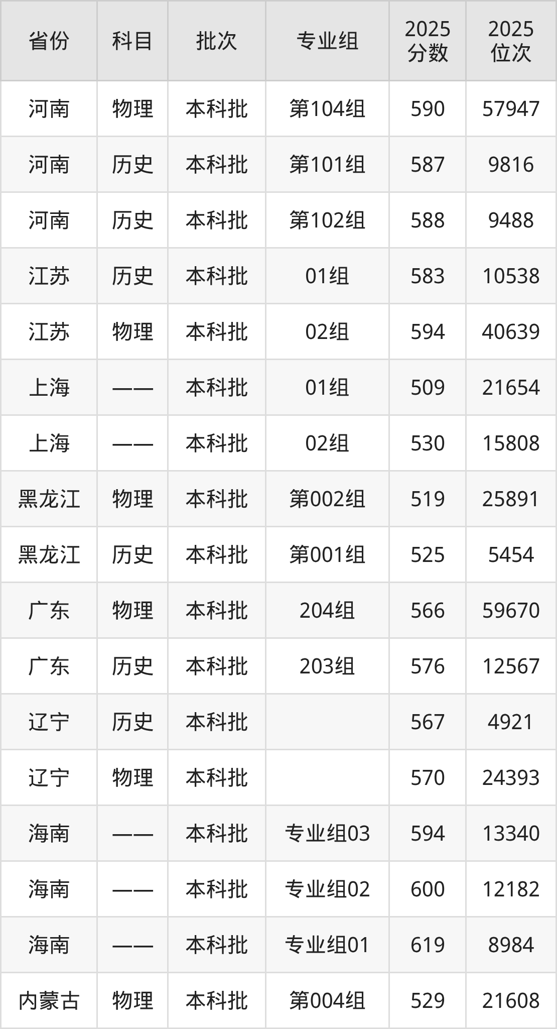 2025年在本科理科进行招生,各专业组分数线详情如下: