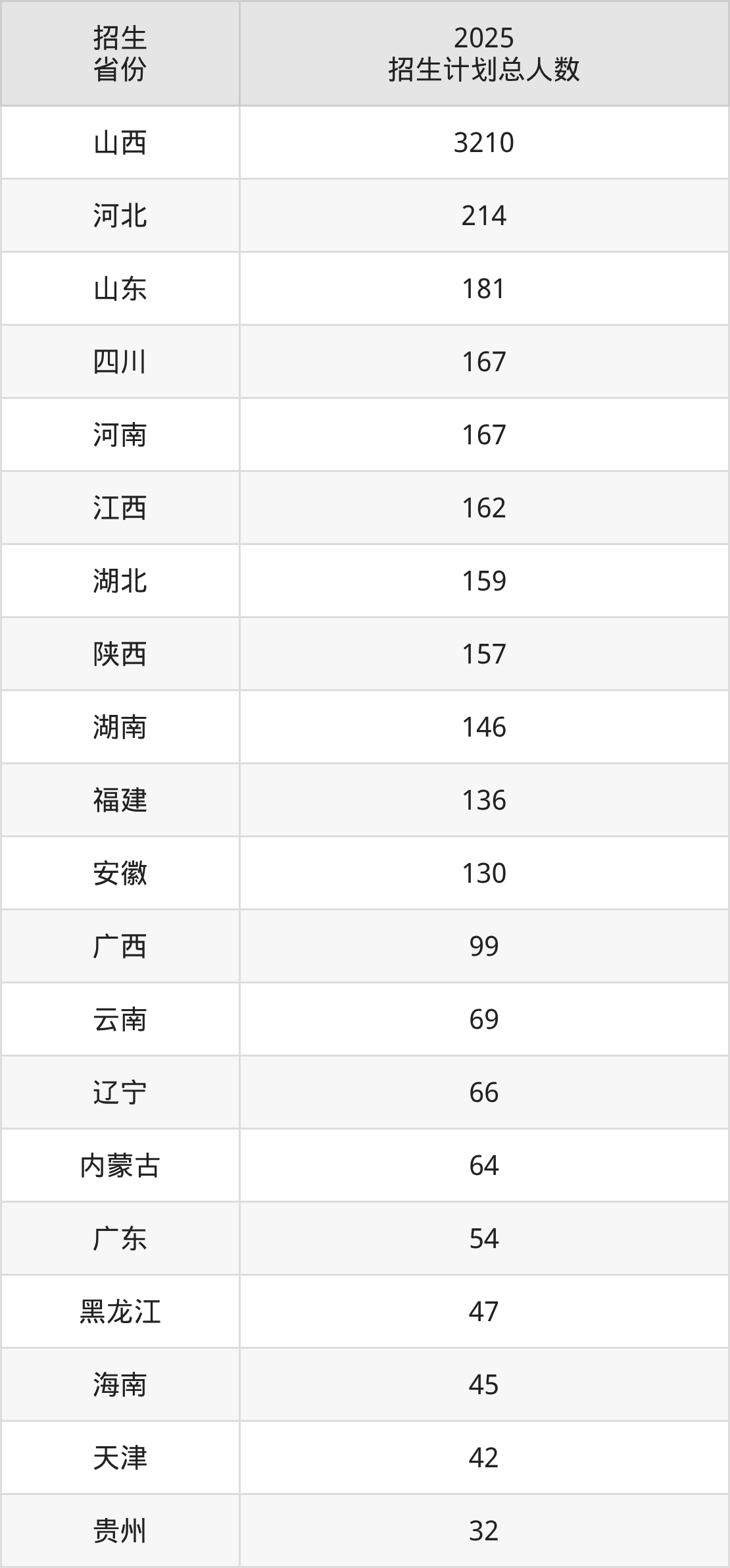 2025年山西大学面向全国29个省市开展本科招生;招生专业共55个,招生人数共5482人。2025年在山西省招生计划总人数是3210人,其中,山西大学在山西省招生人数最多的是软件工程。山西大学在各省具体招生人数情况如下表。