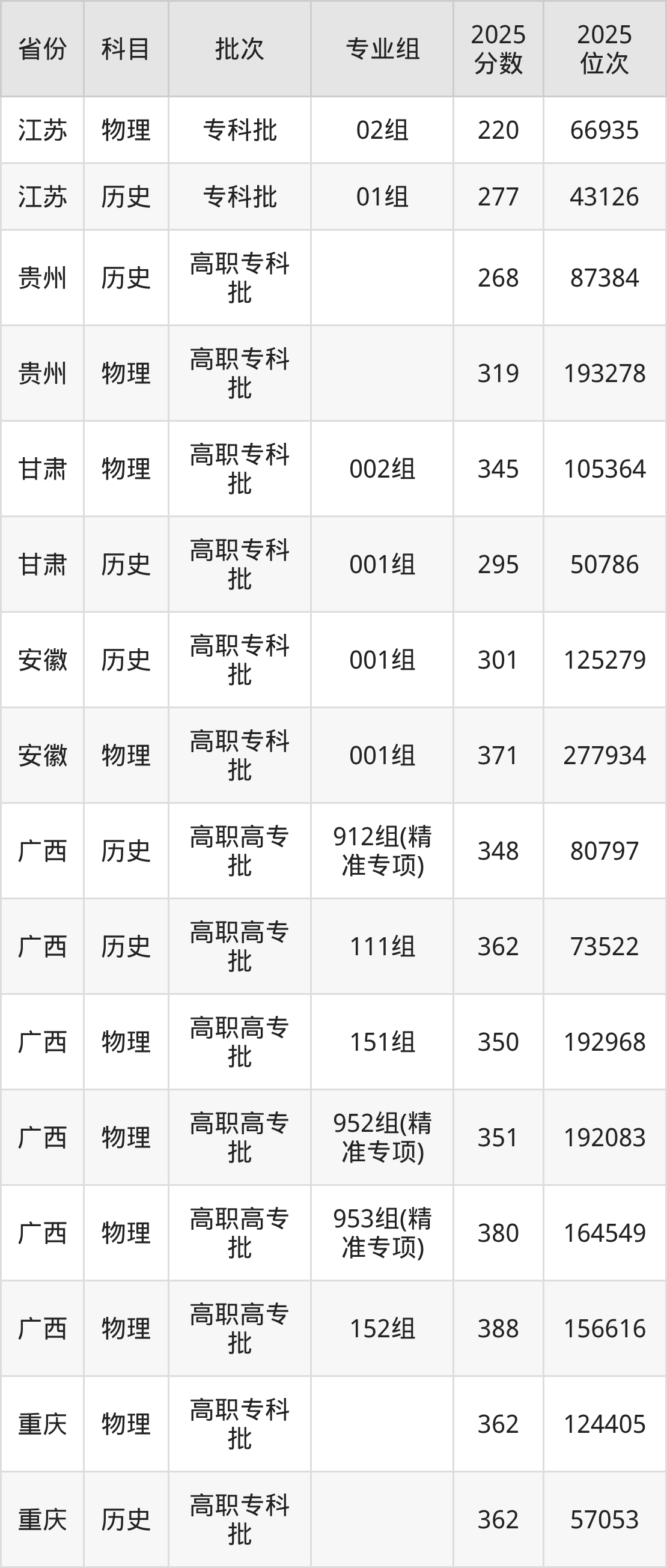 普通类专科历史类最低277分,专科物理类最低220分