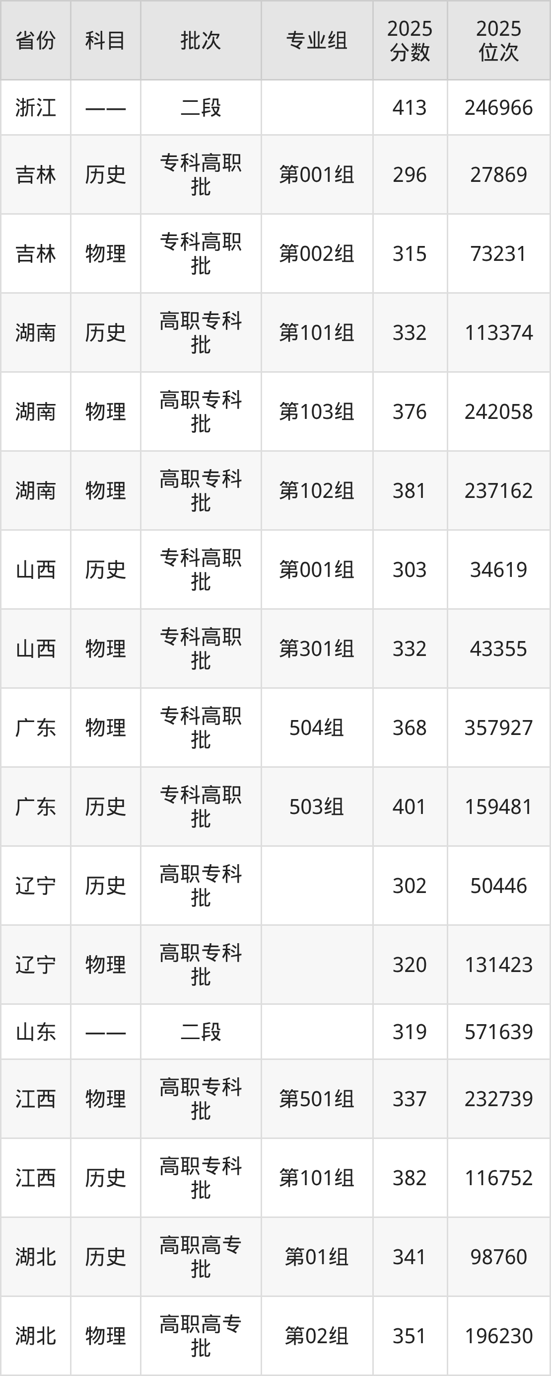 普通类专科历史类最低303分,专科物理类最低332分