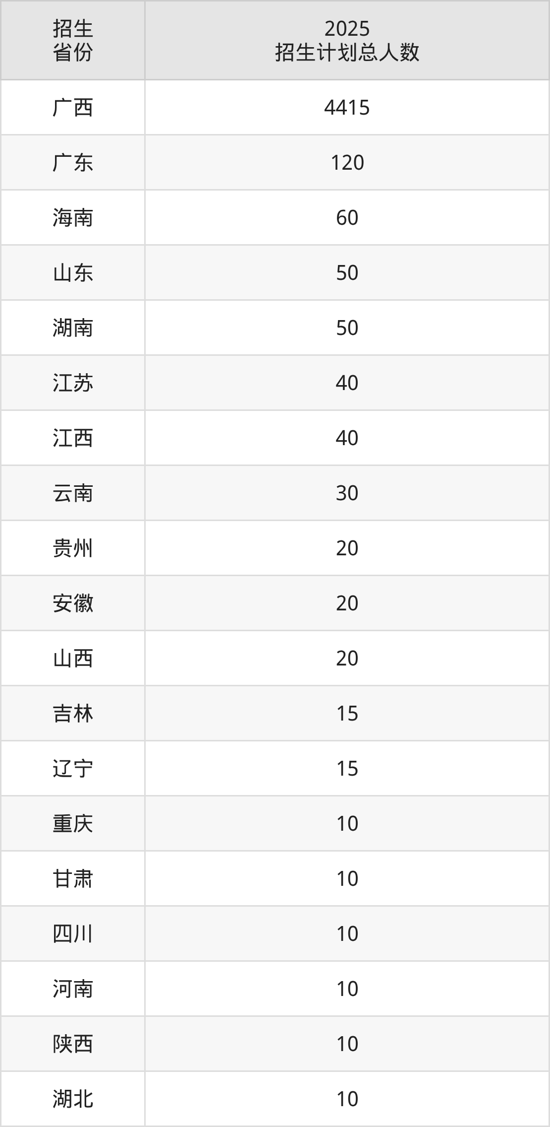 2025年广西机电职业技术学院面向全国19个省市开展专科招生;招生专业共50个,招生人数共4955人。2025年在广西壮族自治区招生计划总人数是4415人,其中,广西机电职业技术学院在广西壮族自治区招生人数最多的是机电一体化技术。广西机电职业技术学院在各省具体招生人数情况如下表。