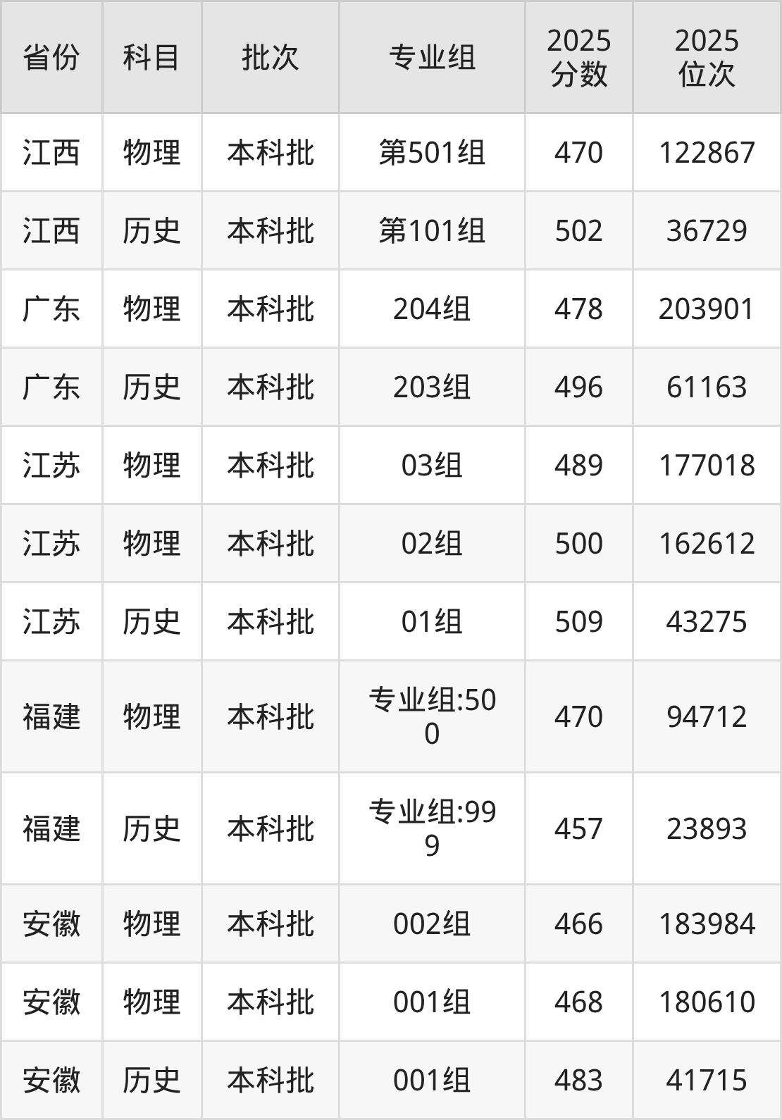 2025年马鞍山学院全国录取分数线是457分到509分,录取最低在福建历史类(专业组:999)、录取最高在江苏历史类(01组)。各省各专业组最低分具有差异,详情如下:
