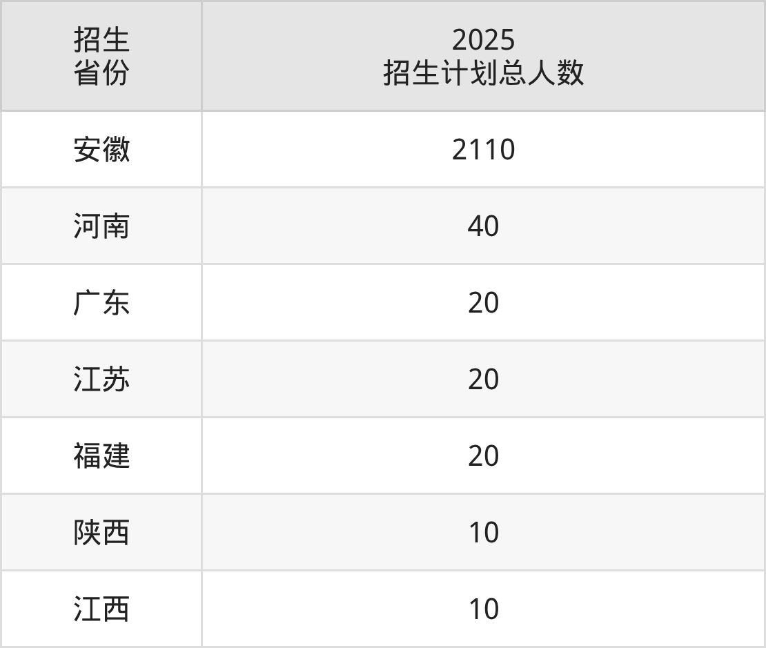 2025年马鞍山学院面向全国7个省市开展本科招生;招生专业共25个,招生人数共2230人。2025年在安徽省招生计划总人数是2110人,其中,马鞍山学院在安徽省招生人数最多的是机械设计制造及其自动化。马鞍山学院在各省具体招生人数情况如下表。