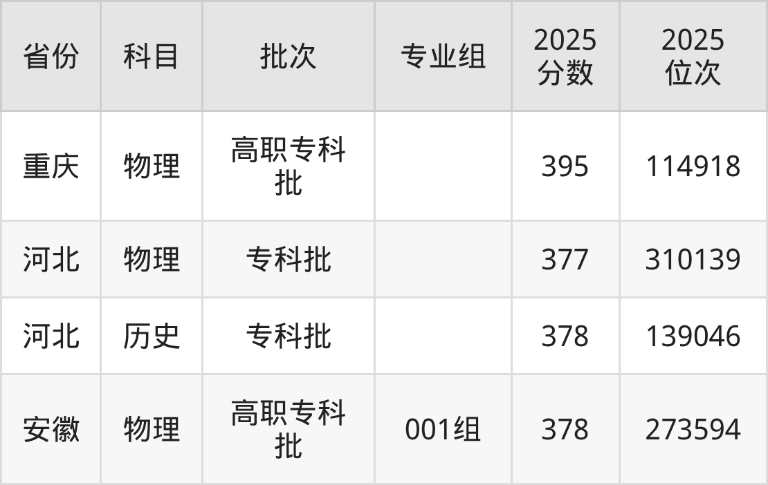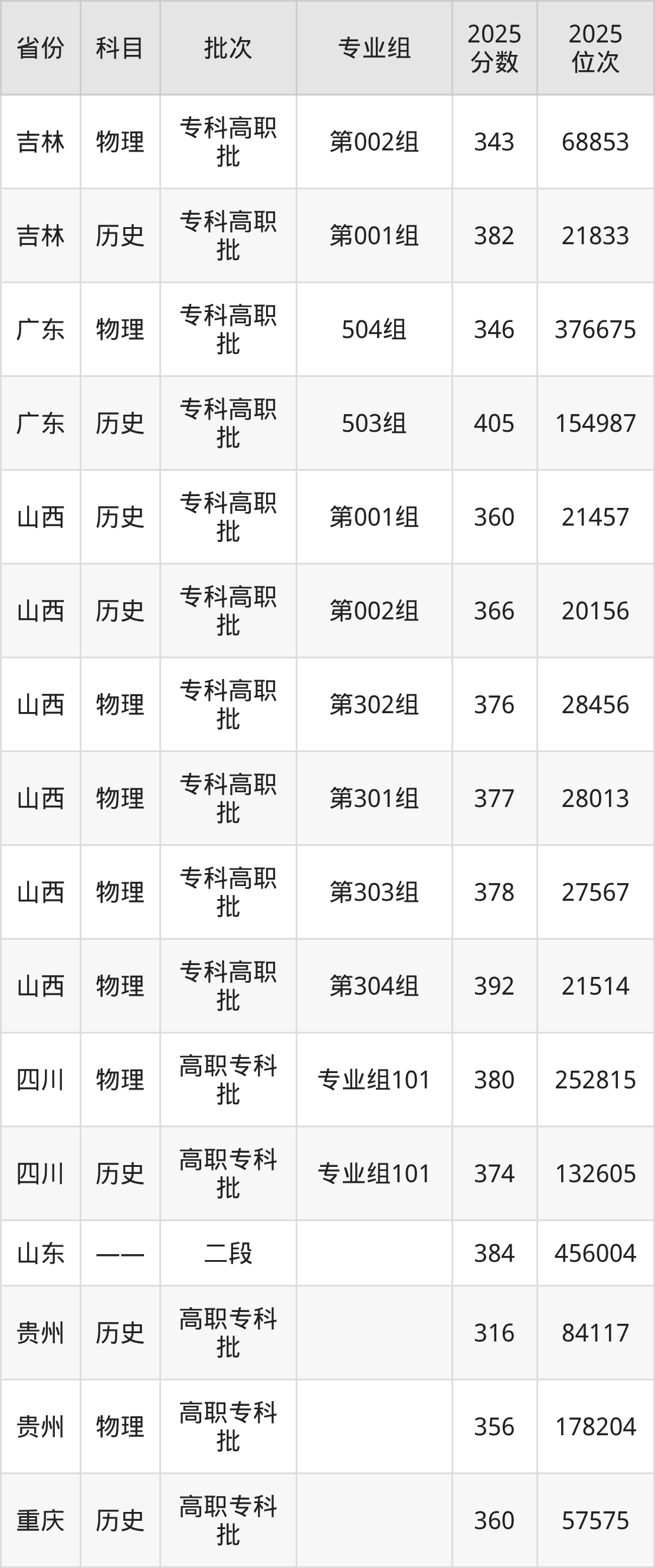 2025年在专科物理类进行招生,各专业组分数线详情如下: