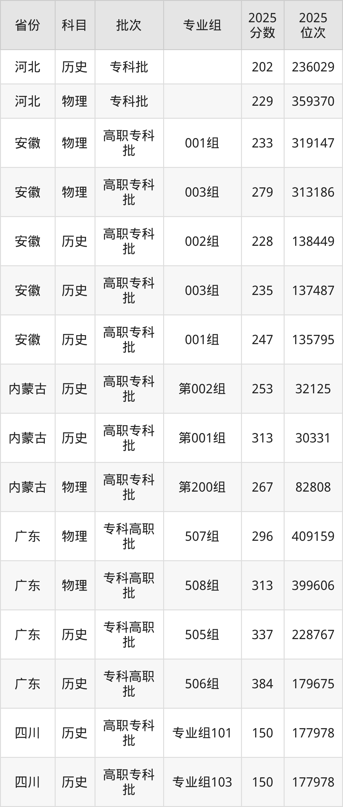 2025年贵州应用技术职业学院全国录取分数线是150分到384分,录取最低在四川历史类(专业组101)、录取最高在广东历史类(506组)。各省各专业组最低分具有差异,详情如下: