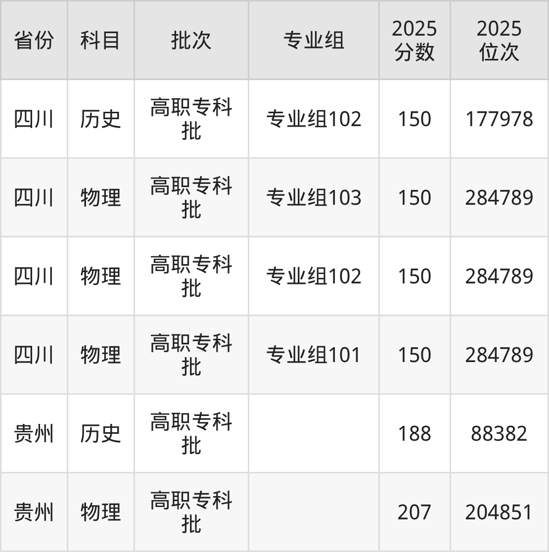 贵州应用技术职业学院专业组101:2025年投档录取最低分为150分,录取最低位次为284789名。