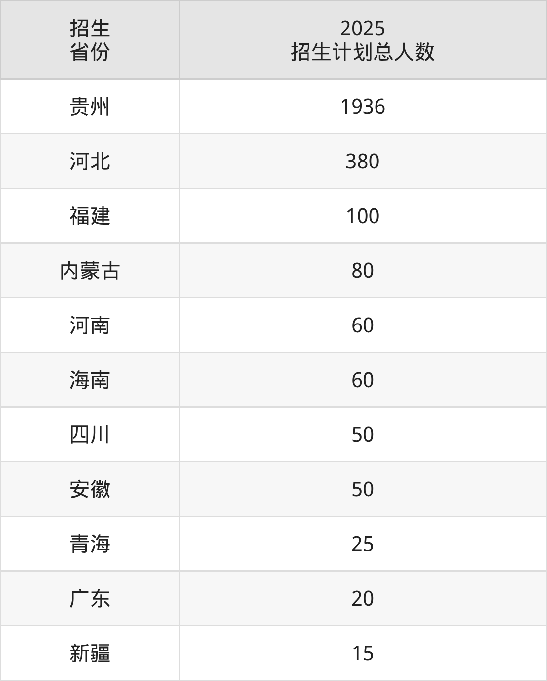 2025年贵州应用技术职业学院面向全国11个省市开展专科招生;招生专业共23个,招生人数共2776人。2025年在贵州省招生计划总人数是1936人,其中,贵州应用技术职业学院在贵州省招生人数最多的是护理。贵州应用技术职业学院在各省具体招生人数情况如下表。