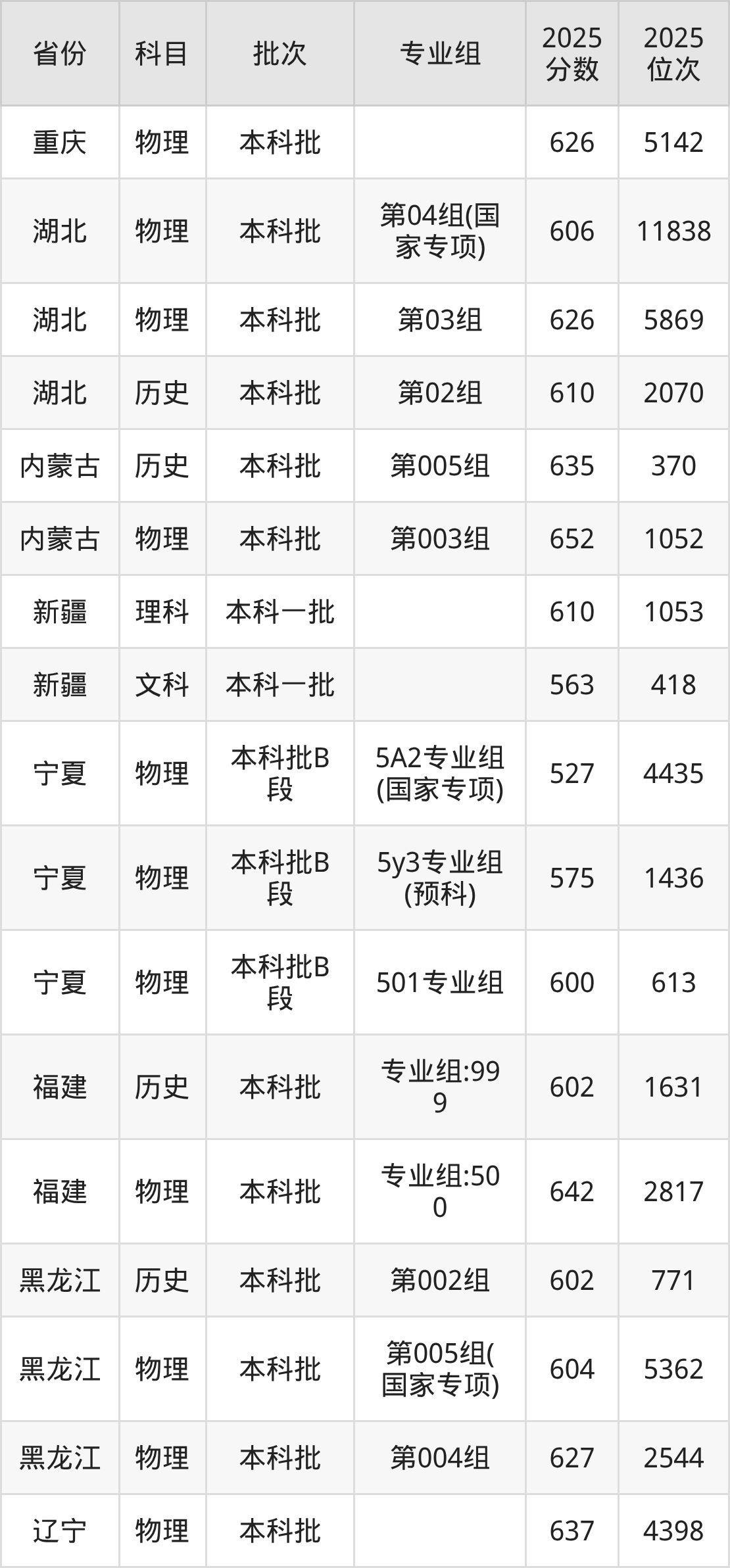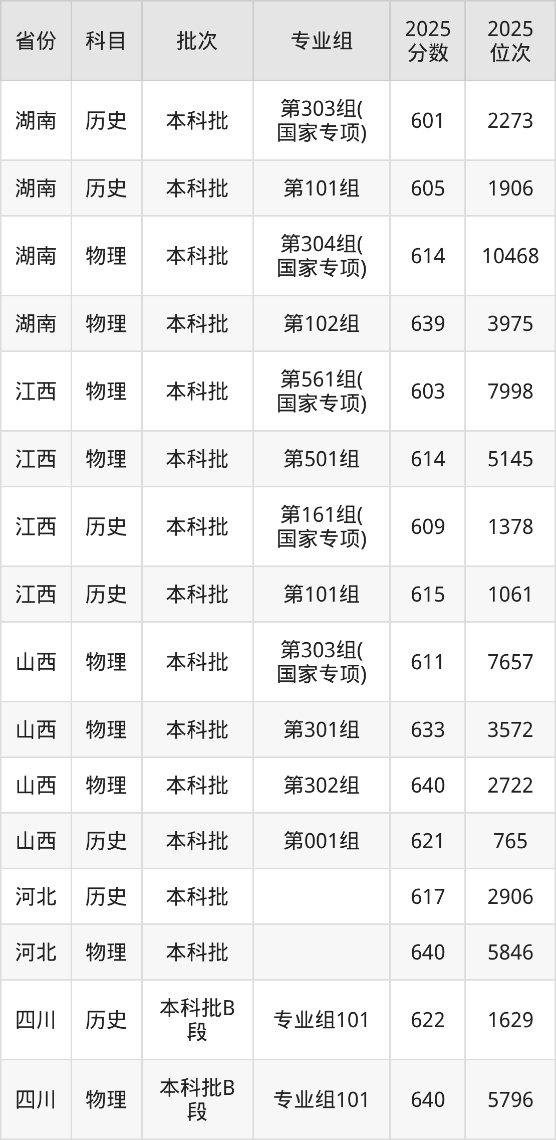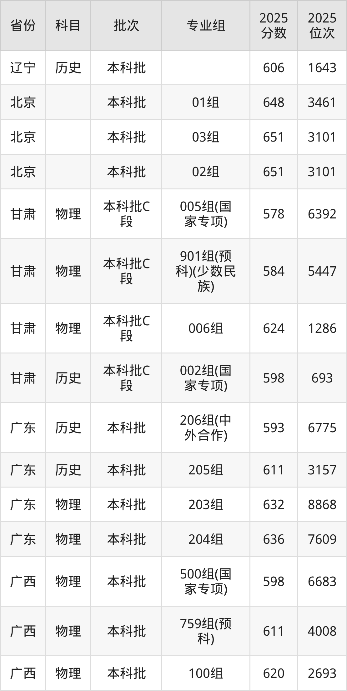 2025年在本科物理类进行招生,各专业组分数线详情如下: