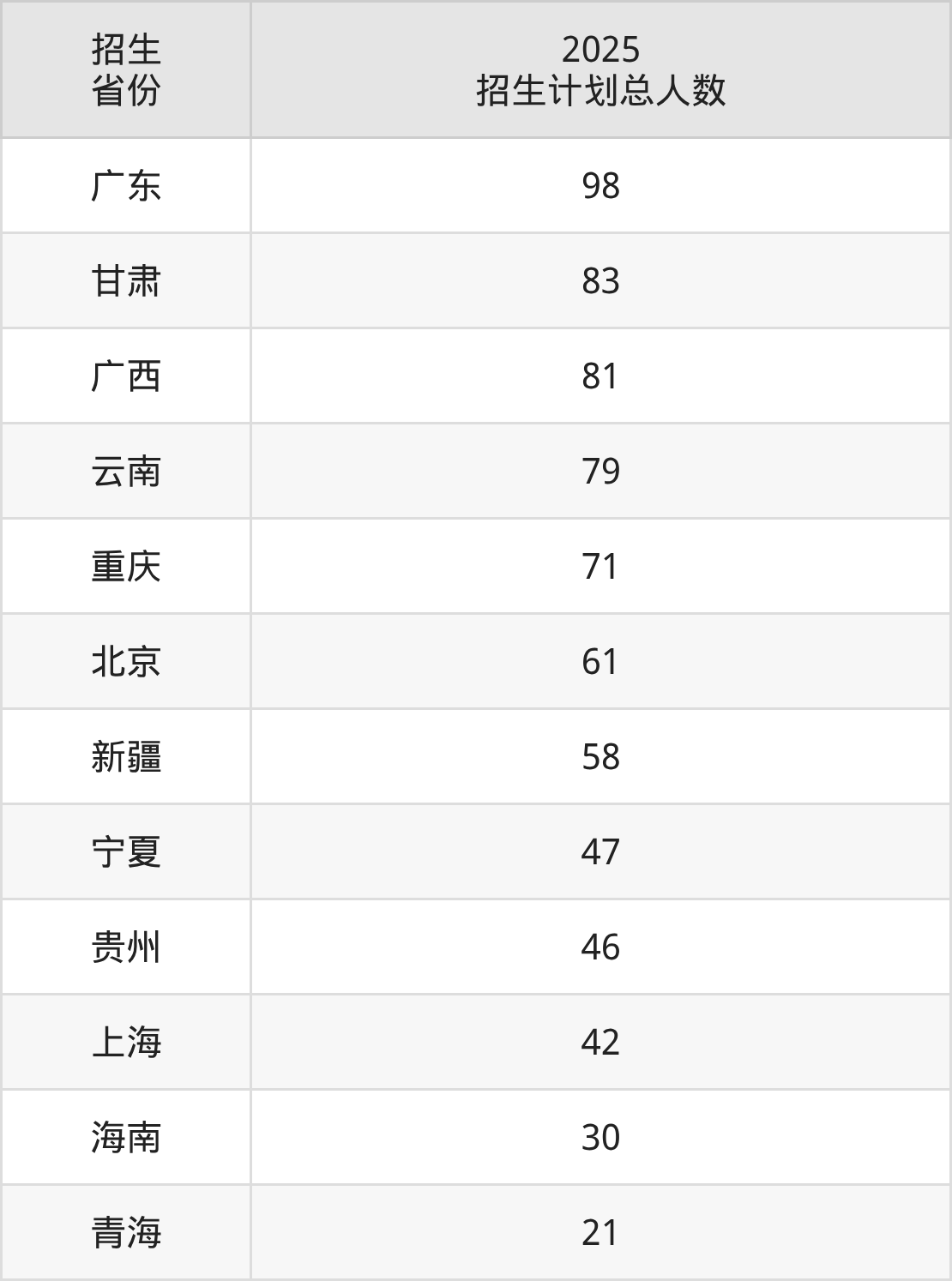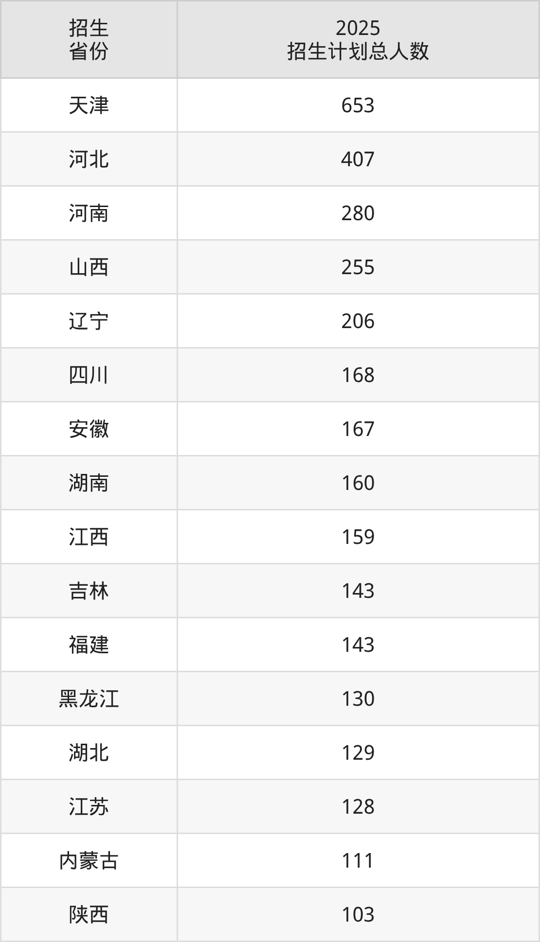 2025年天津大学面向全国28个省市开展本科招生;招生专业共15个,招生人数共4058人。2025年在天津市招生计划总人数是653人,其中,天津大学在天津市招生人数最多的是工科试验班。天津大学在各省具体招生人数情况如下表。