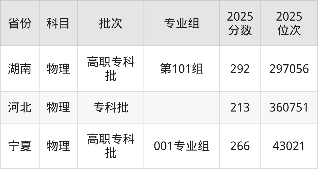 2025年在专科物理类进行招生,各专业组分数线详情如下: