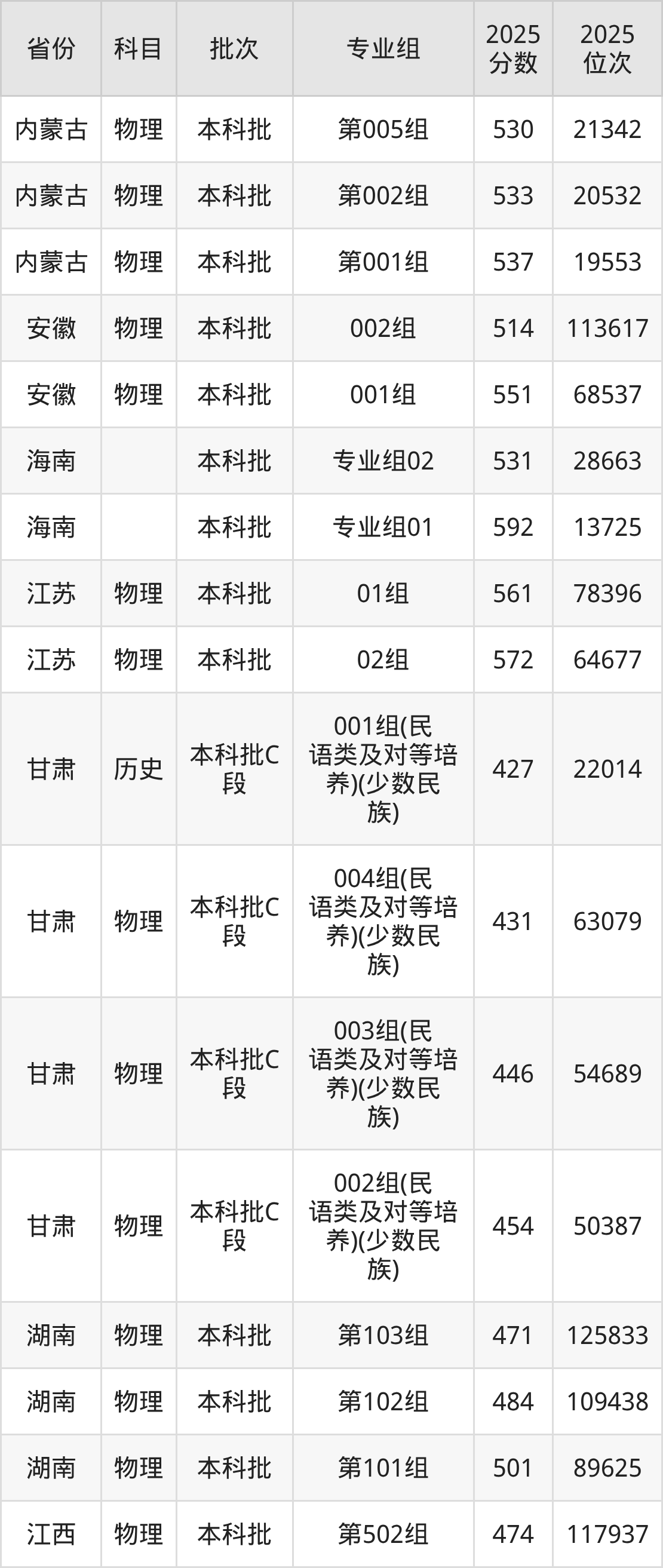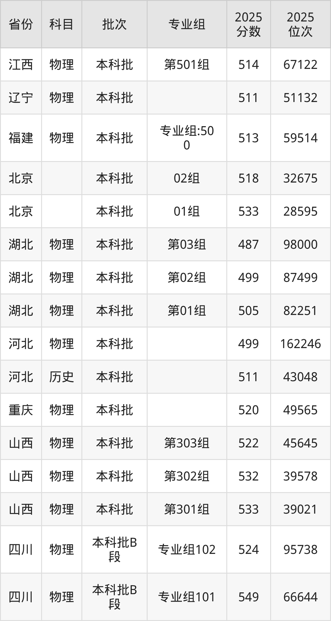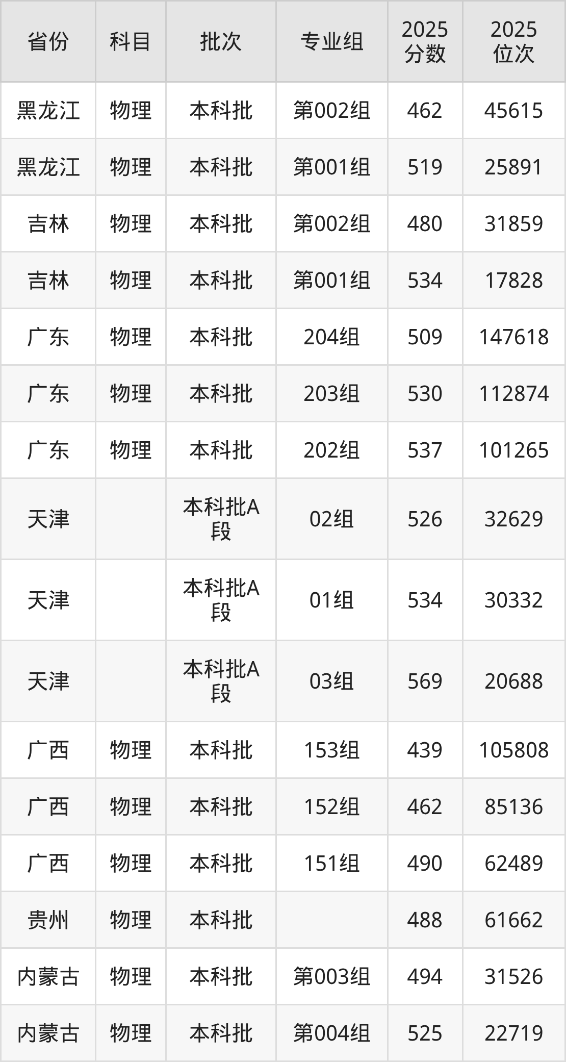 2025年在本科物理类进行招生,各专业组分数线详情如下: