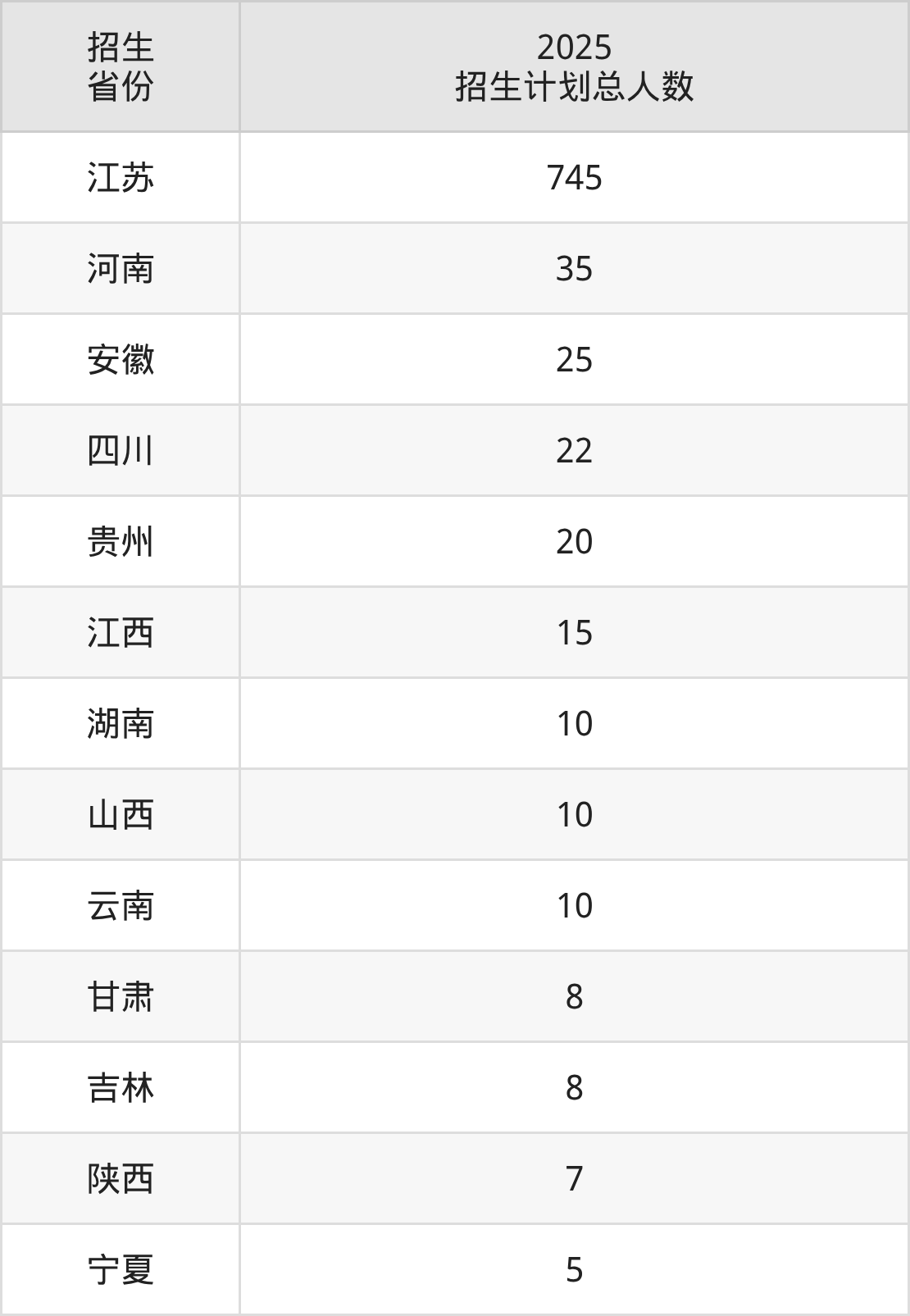 2025年常州纺织服装职业技术学院面向全国13个省市开展专科招生;招生专业共24个,招生人数共920人。2025年在江苏省招生计划总人数是745人,其中,常州纺织服装职业技术学院在江苏省招生人数最多的是机械制造及自动化。常州纺织服装职业技术学院在各省具体招生人数情况如下表。