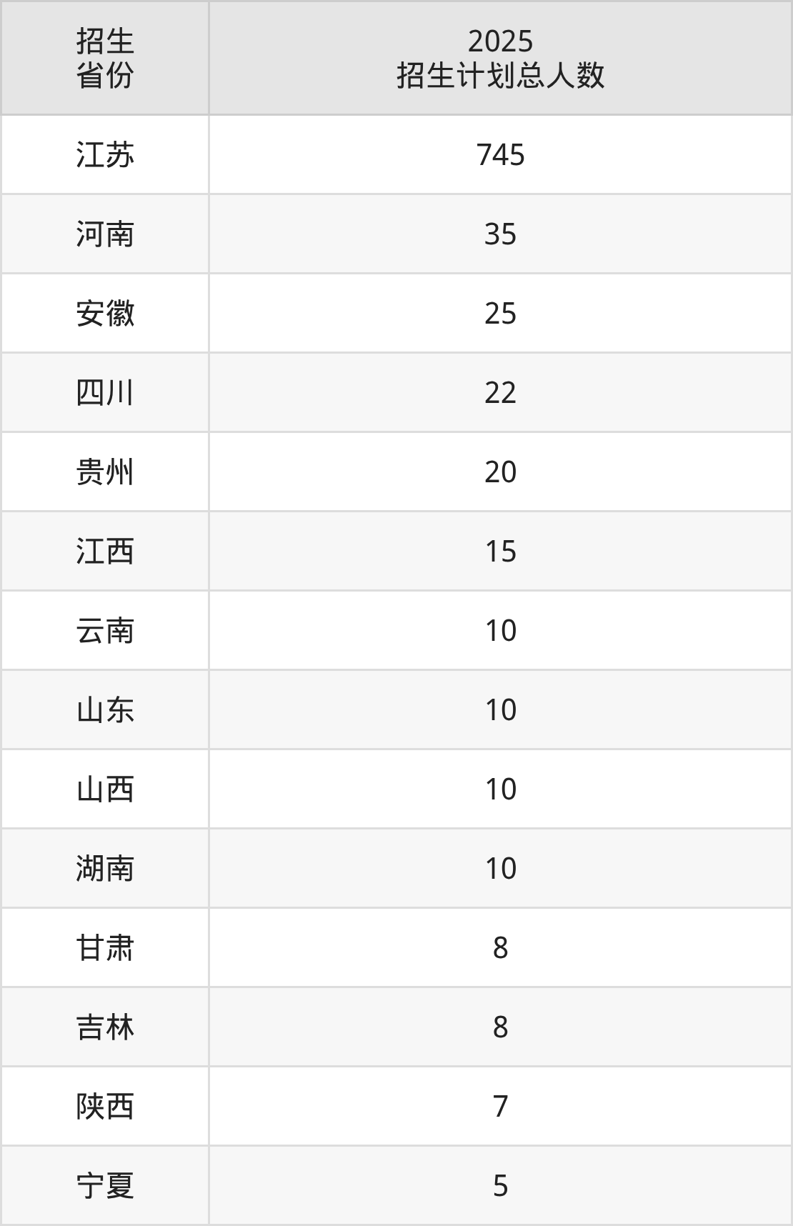 2025年常州纺织服装职业技术学院面向全国14个省市开展专科招生;招生专业共24个,招生人数共930人。2025年在江苏省招生计划总人数是745人,其中,常州纺织服装职业技术学院在江苏省招生人数最多的是机械制造及自动化。常州纺织服装职业技术学院在各省具体招生人数情况如下表。