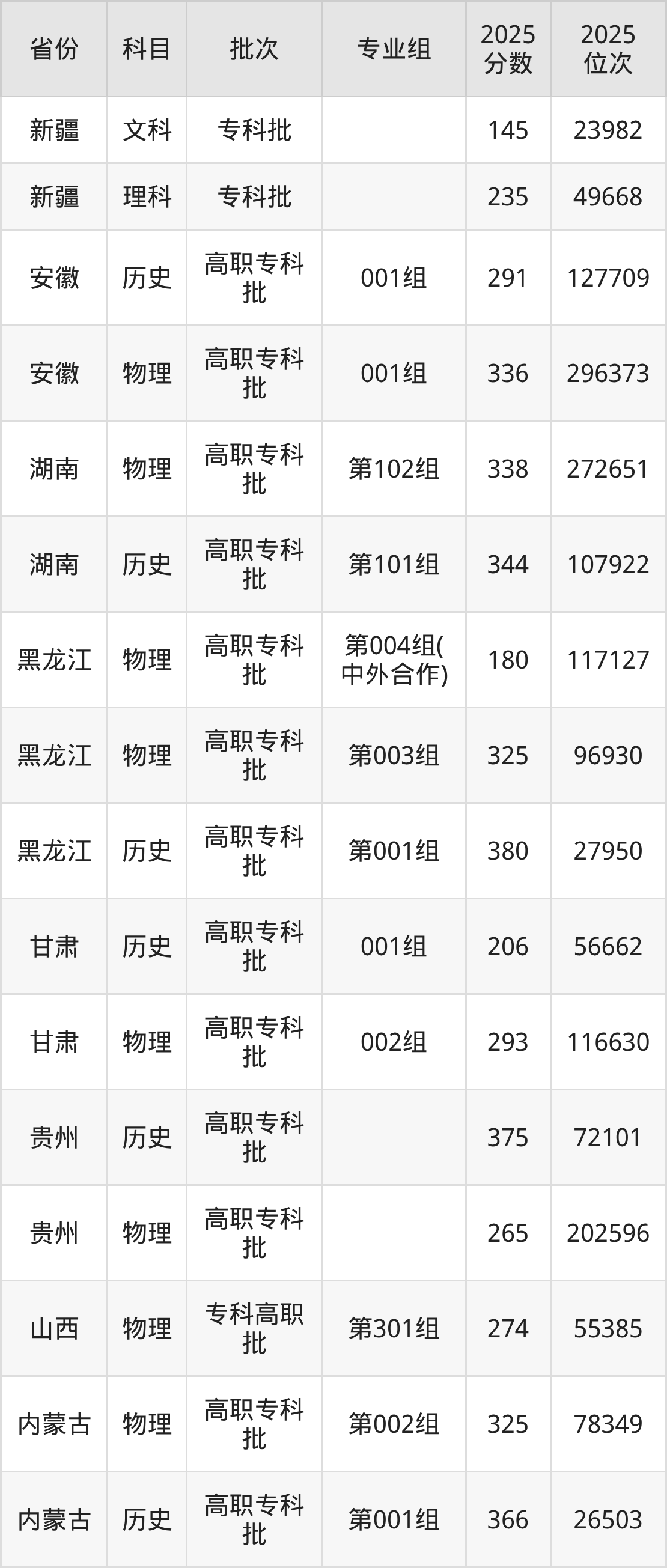 黑龙江建筑职业技术学院第003组:2025年投档录取最低分为325分,录取最低位次为96930名。