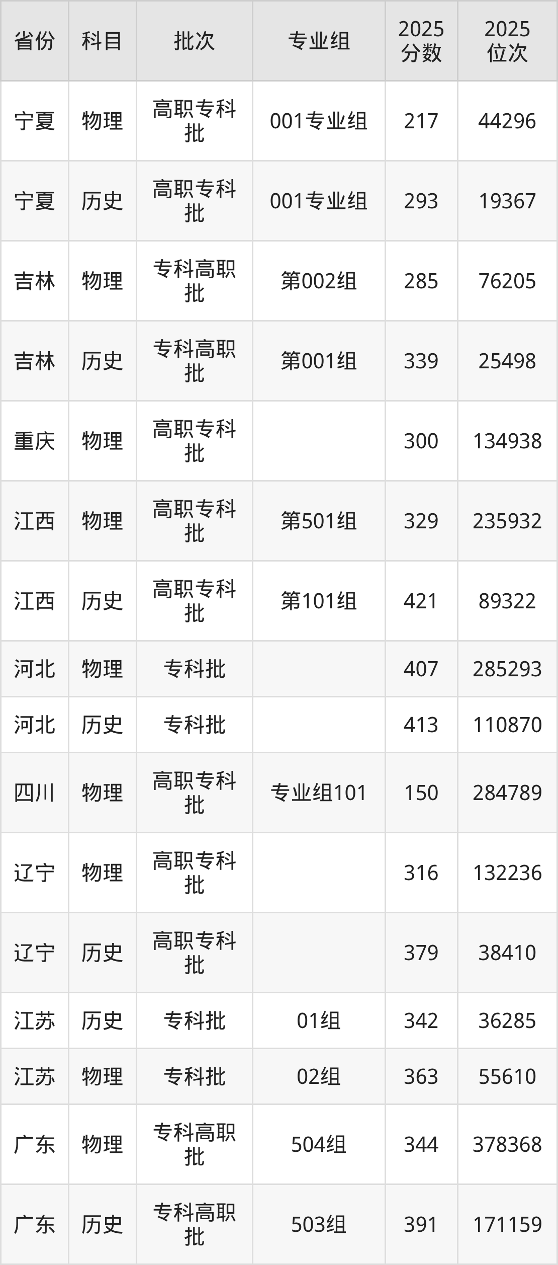 普通类专科物理类最低217分,专科历史类最低293分