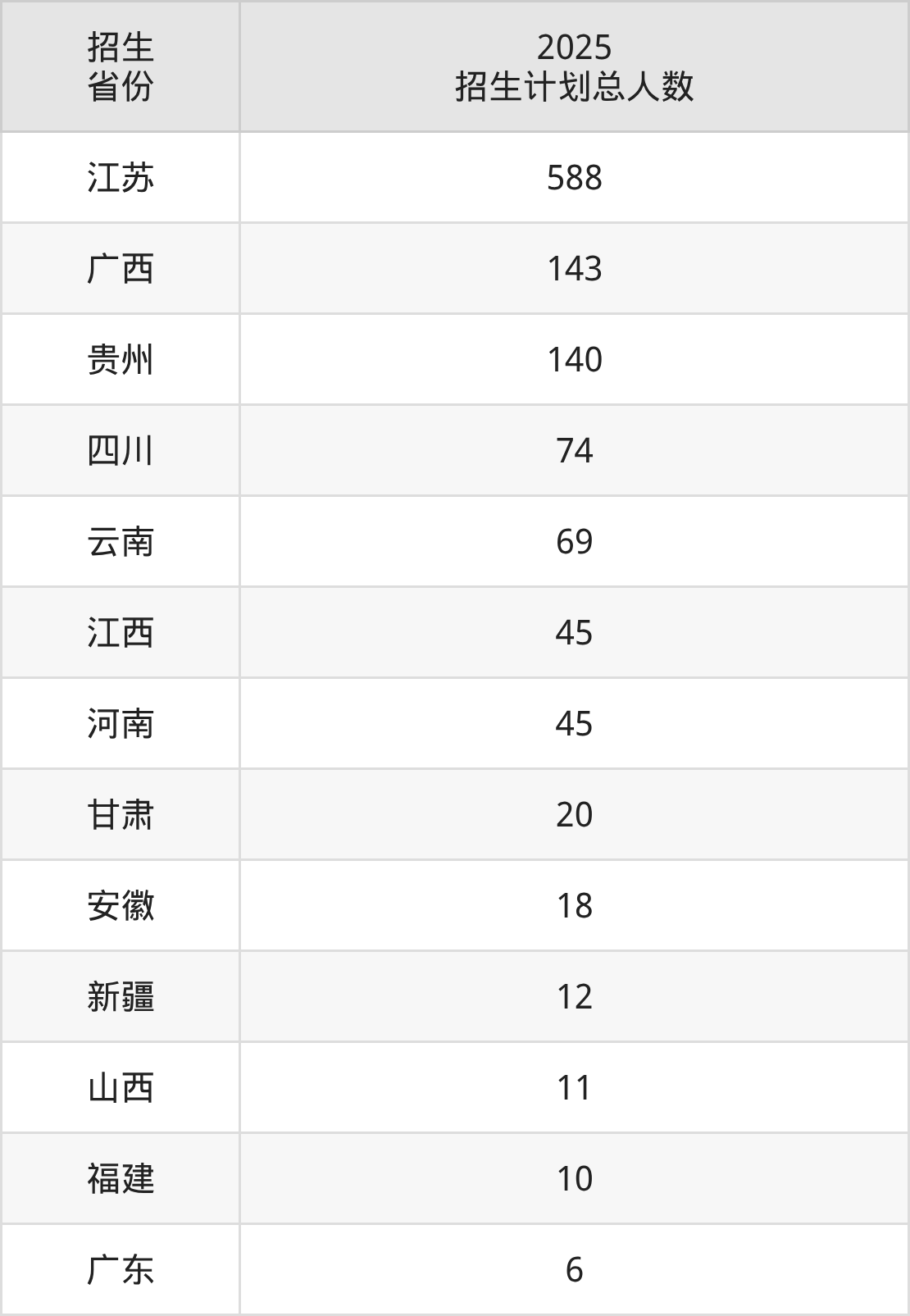 2025年苏州科技大学天平学院面向全国13个省市开展本科招生;招生专业共20个,招生人数共1181人。2025年在江苏省招生计划总人数是588人,其中,苏州科技大学天平学院在江苏省招生人数最多的是通信工程。苏州科技大学天平学院在各省具体招生人数情况如下表。