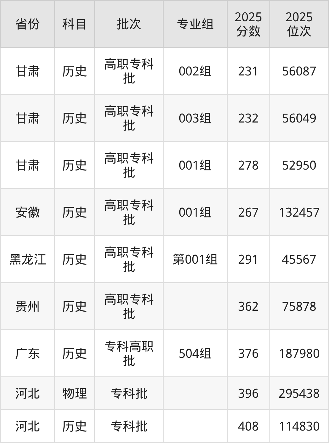 专科历史类投档录取最低231分