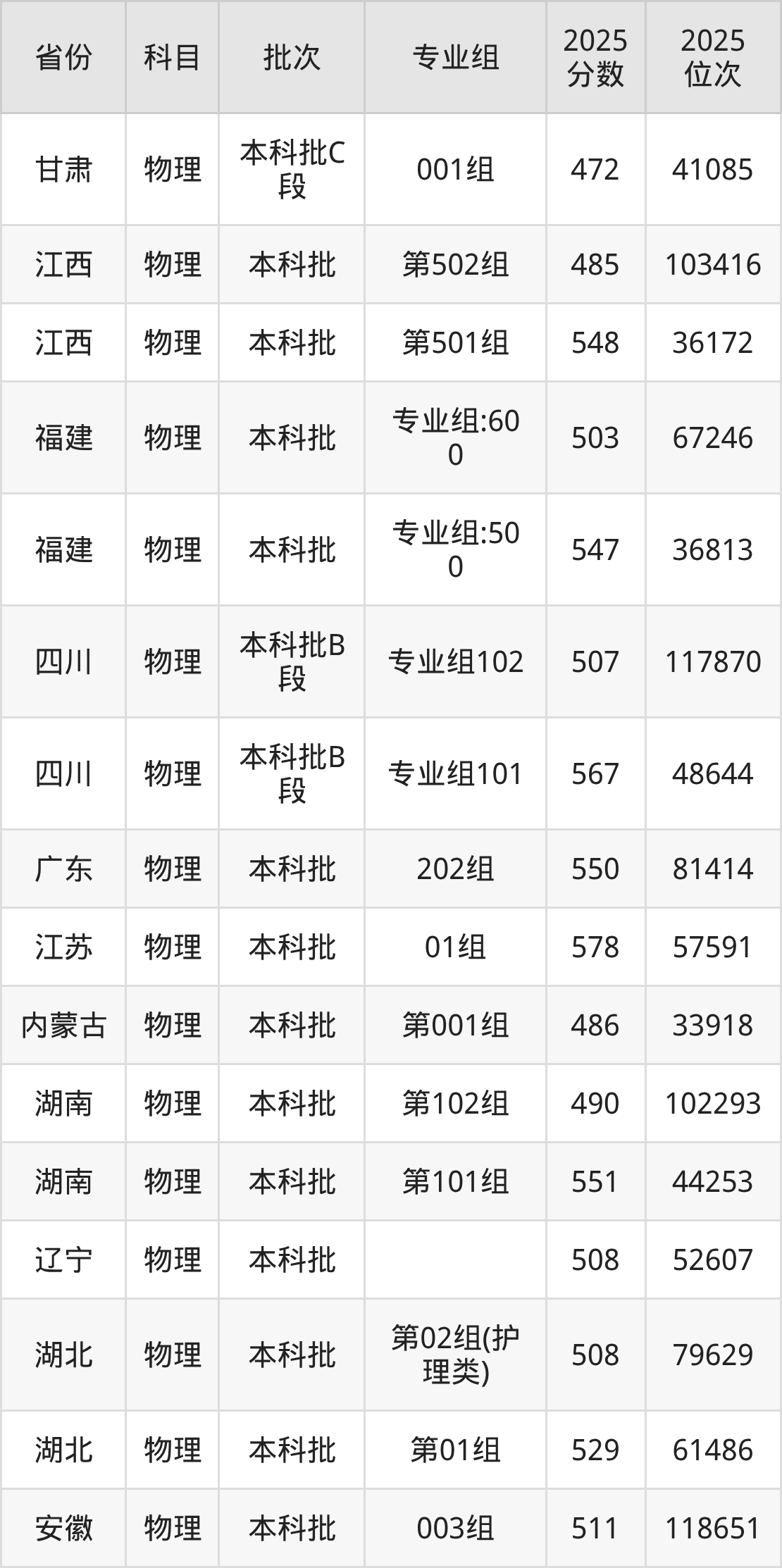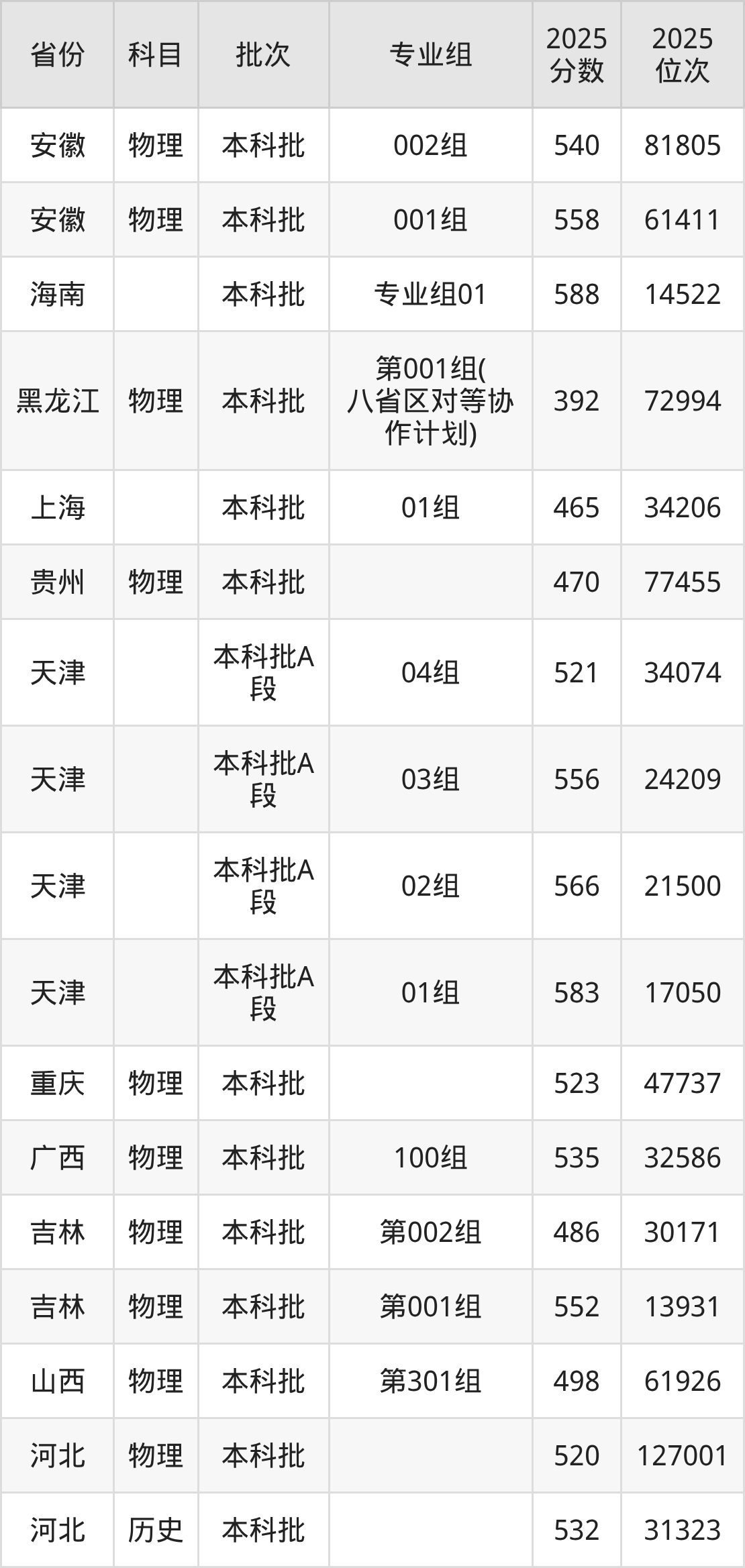 2025年在本科物理类进行招生,各专业组分数线详情如下:
