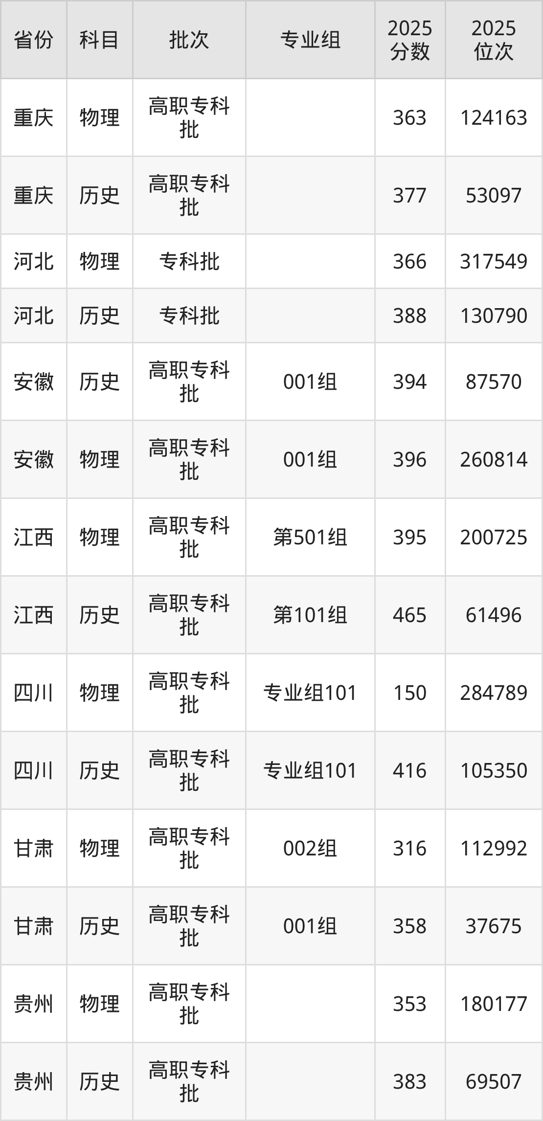 普通类专科物理类最低353分,专科历史类最低383分