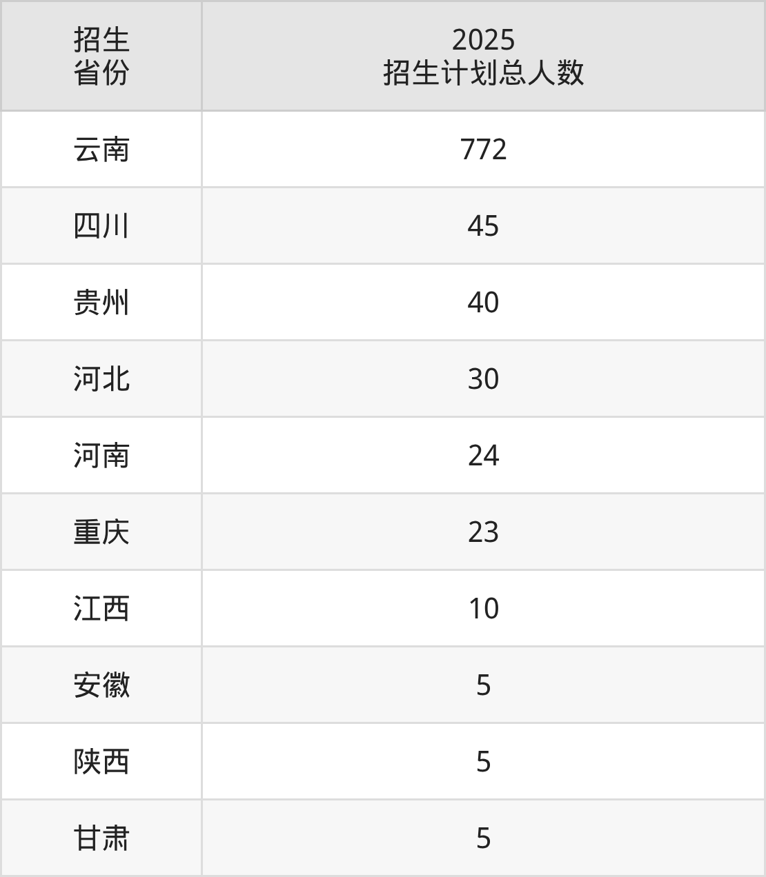 2025年云南财经职业学院面向全国10个省市开展专科招生;招生专业共17个,招生人数共959人。2025年在云南省招生计划总人数是772人,其中,云南财经职业学院在云南省招生人数最多的是大数据与会计。云南财经职业学院在各省具体招生人数情况如下表。