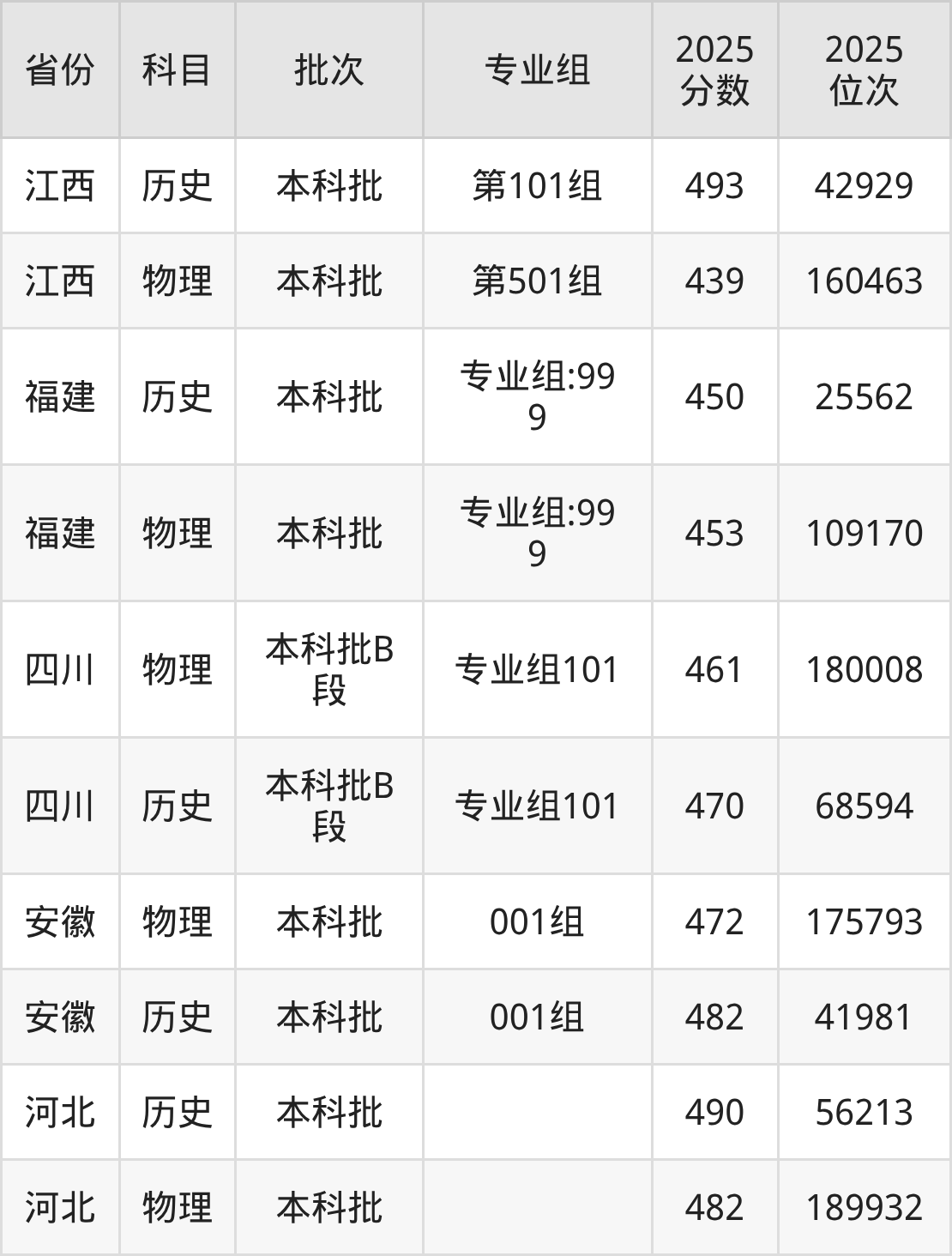 普通类本科物理类最低439分,本科历史类最低493分
