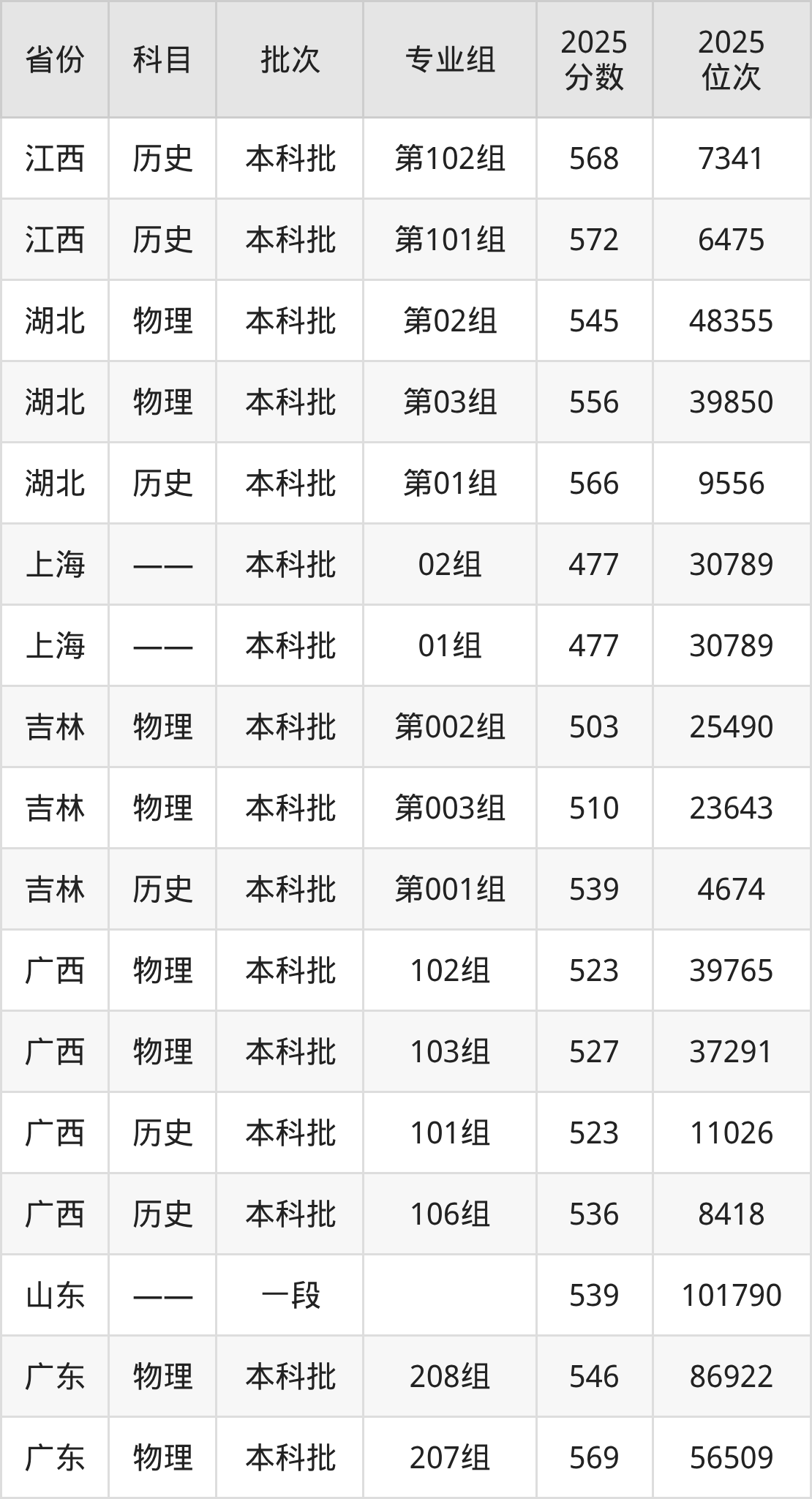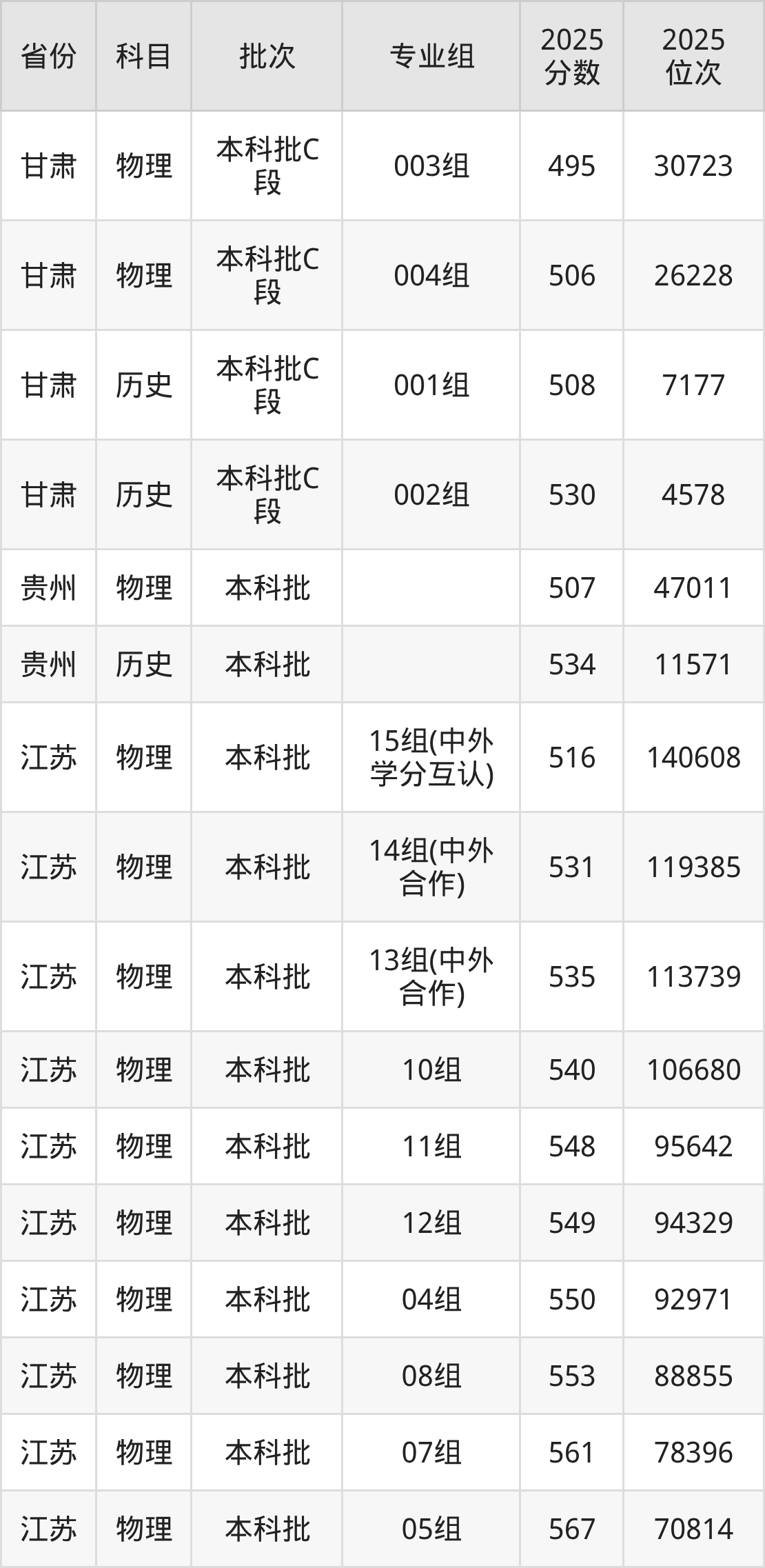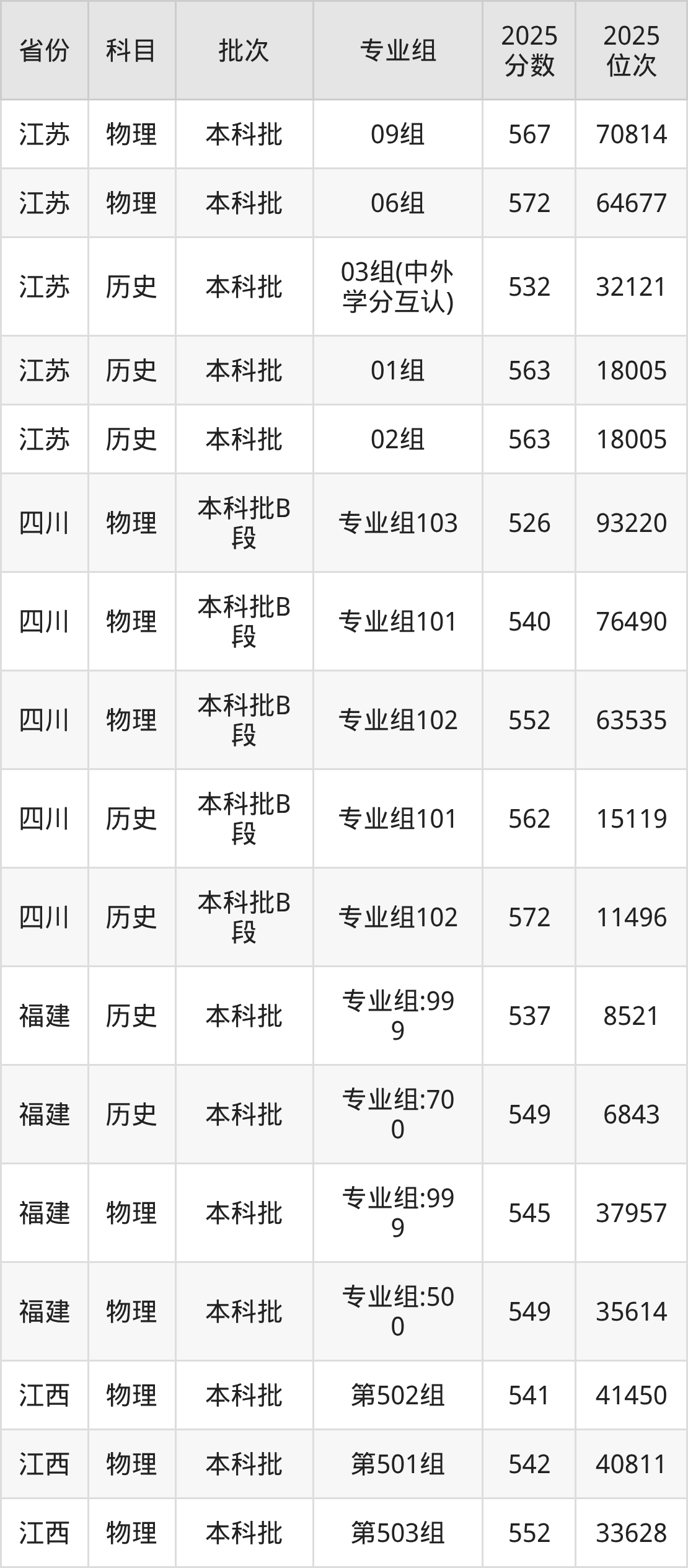 2025年在本科物理类进行招生,各专业组分数线详情如下: