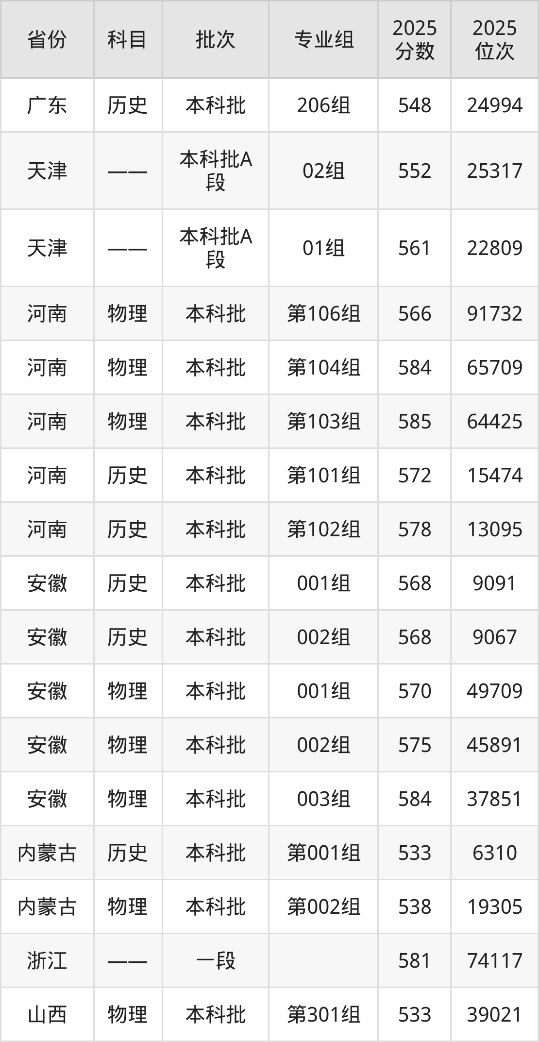2025年投档录取最低分为533分,录取最低位次为10123名。
