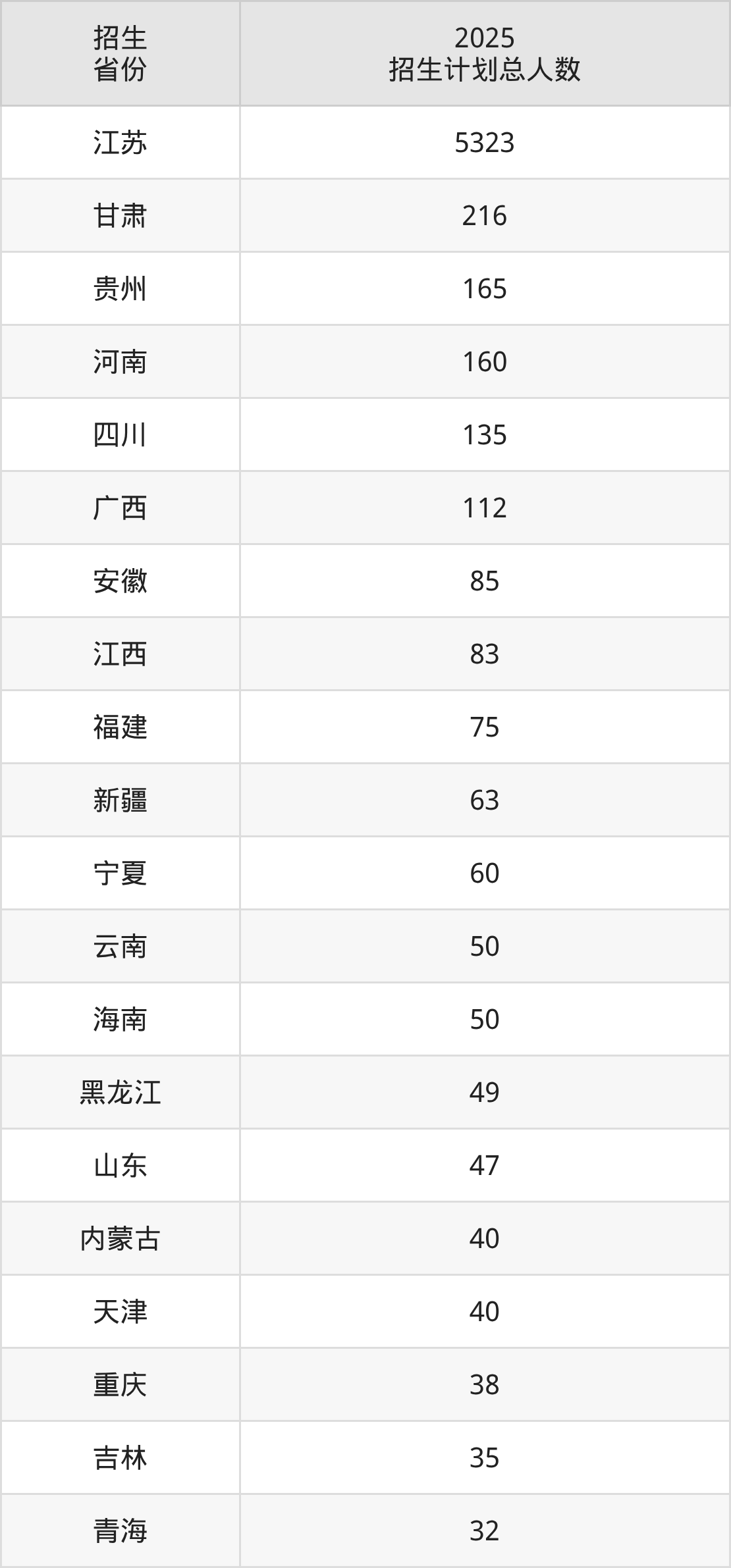 2025年常州大学面向全国28个省市开展本科招生;招生专业共55个,招生人数共7015人。2025年在江苏省招生计划总人数是5323人,其中,常州大学在江苏省招生人数最多的是化学工程与工艺。常州大学在各省具体招生人数情况如下表。