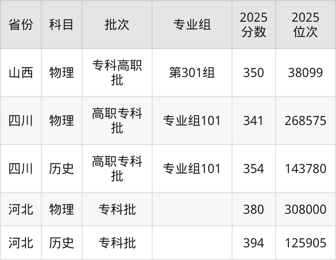 2025年在专科物理类进行招生,各专业组分数线详情如下: