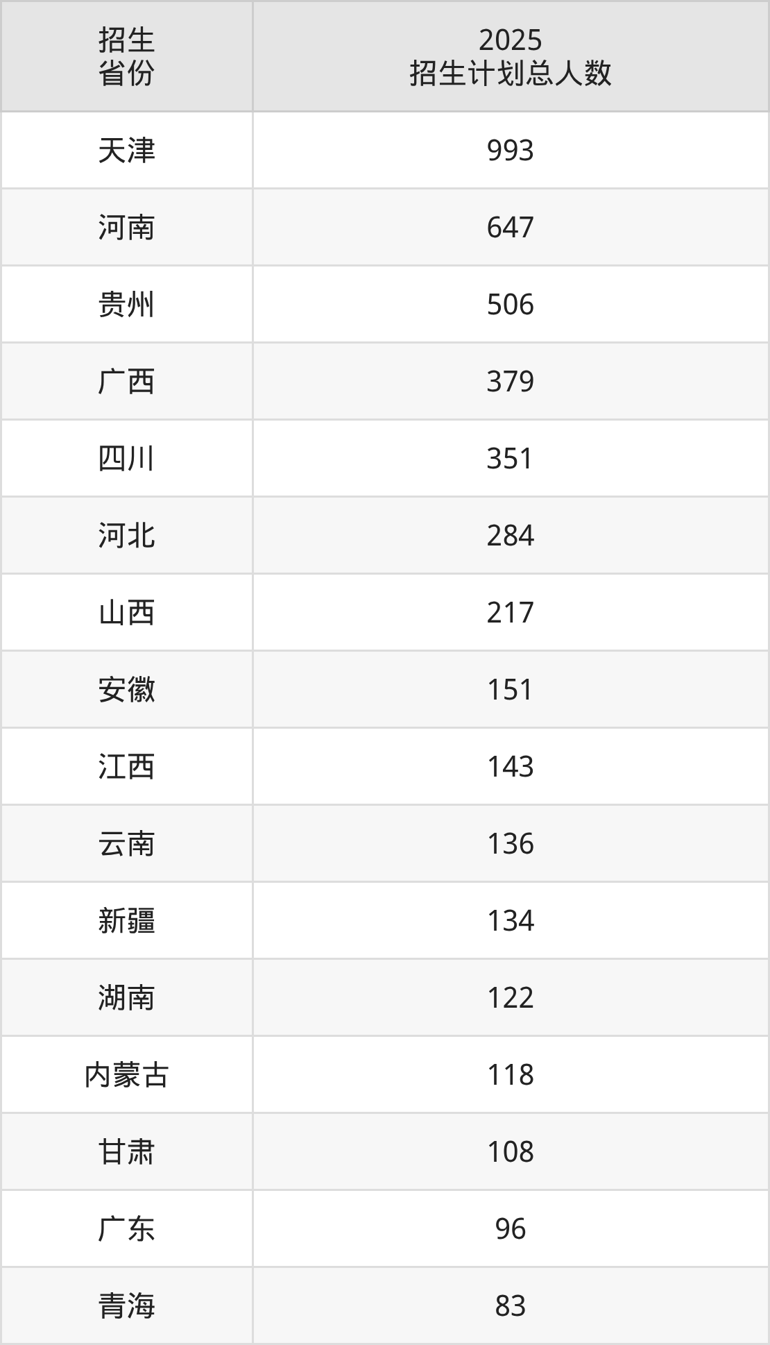 2025年天津商业大学面向全国28个省市开展本科招生;招生专业共38个,招生人数共4829人。2025年在天津市招生计划总人数是993人,其中,天津商业大学在天津市招生人数最多的是经济学类。天津商业大学在各省具体招生人数情况如下表。