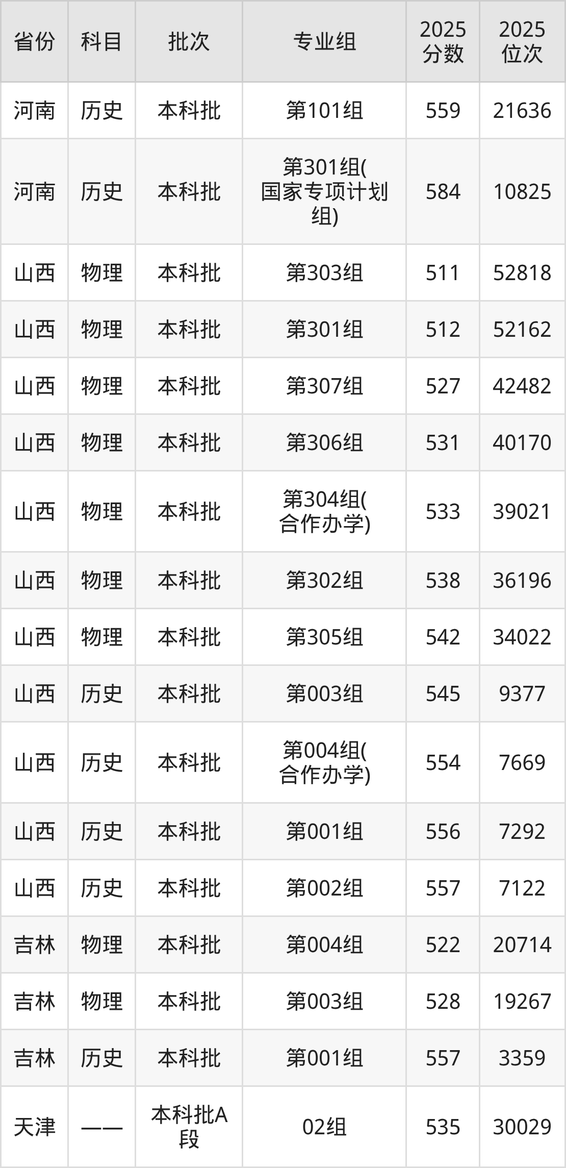 天津商业大学第301组(国家专项计划组):2025年投档录取最低分为584分,录取最低位次为10825名。