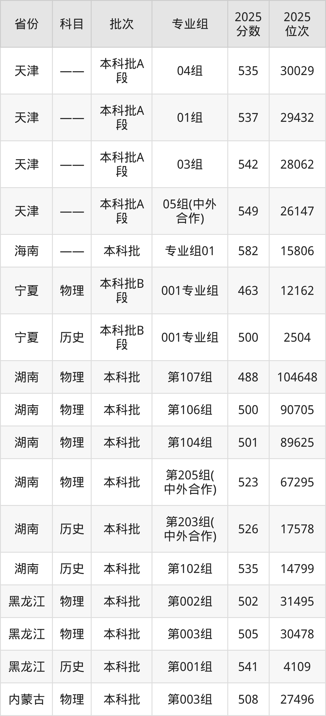 天津商业大学第001组:2025年投档录取最低分为533分,录取最低位次为6310名。