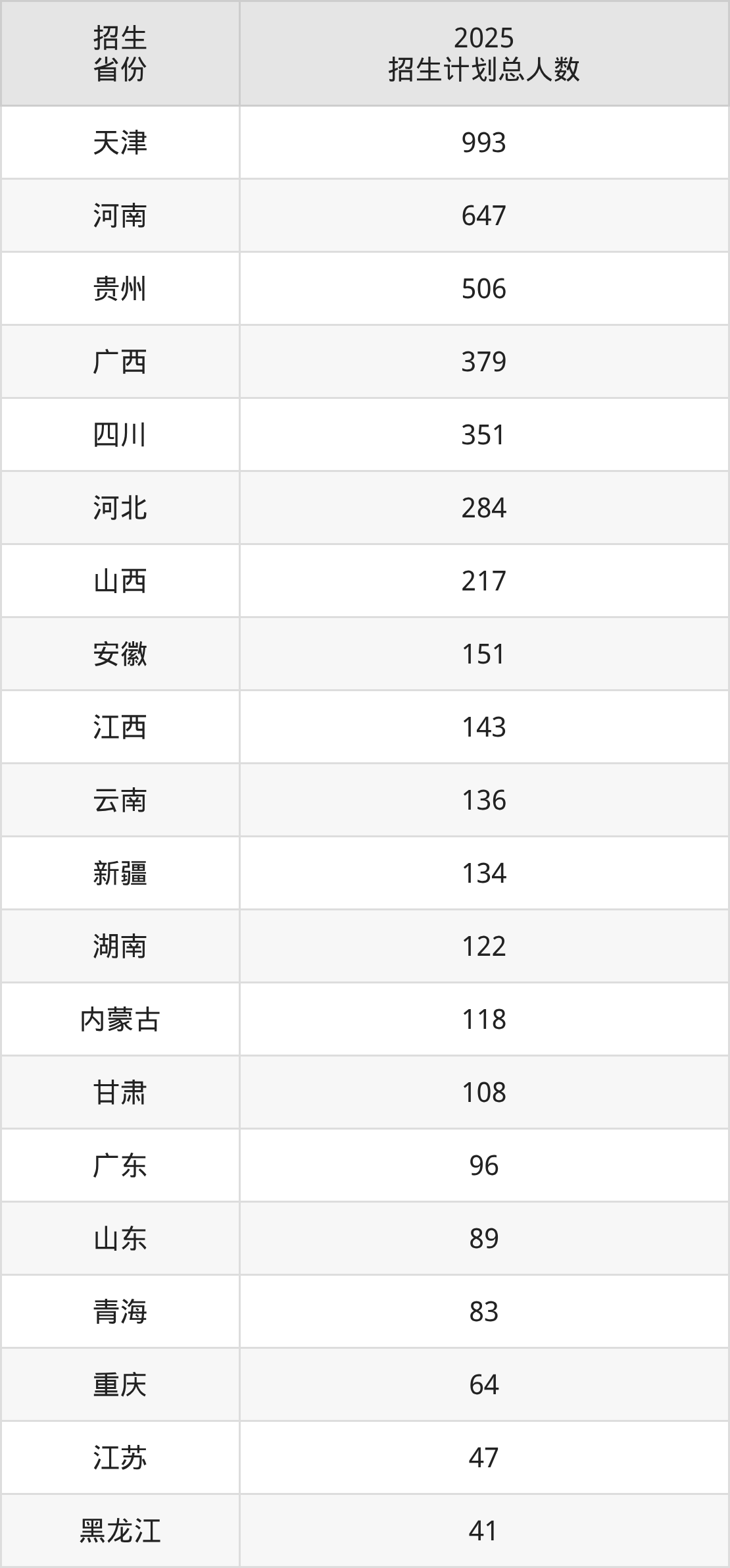 2025年天津商业大学面向全国29个省市开展本科招生;招生专业共38个,招生人数共4918人。2025年在天津市招生计划总人数是993人,其中,天津商业大学在天津市招生人数最多的是经济学类。天津商业大学在各省具体招生人数情况如下表。
