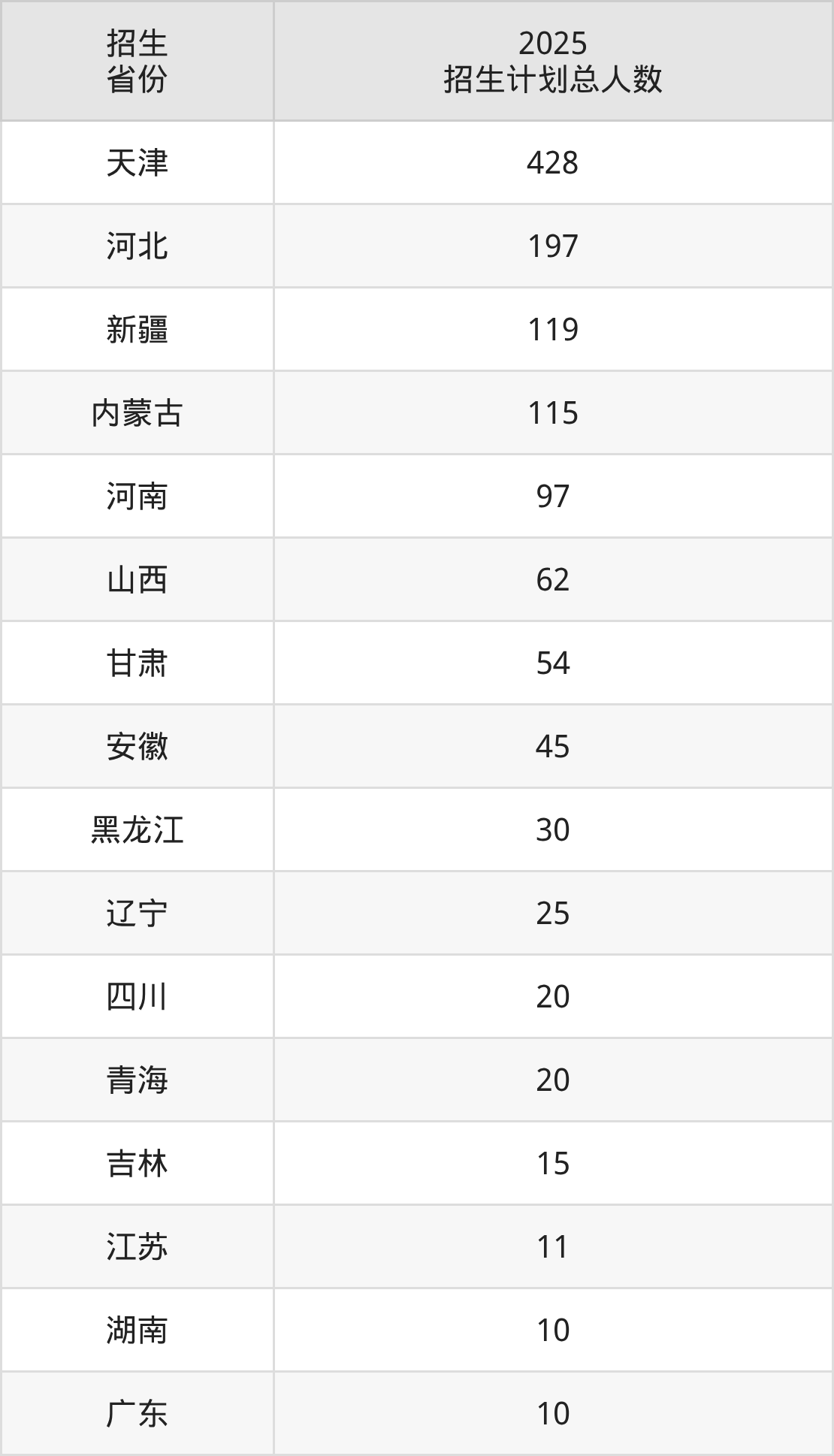 2025年天津市职业大学面向全国24个省市开展专科招生;招生专业共43个,招生人数共1334人。2025年在天津市招生计划总人数是428人,其中,天津市职业大学在天津市招生人数最多的是化工技术类。天津市职业大学在各省具体招生人数情况如下表。