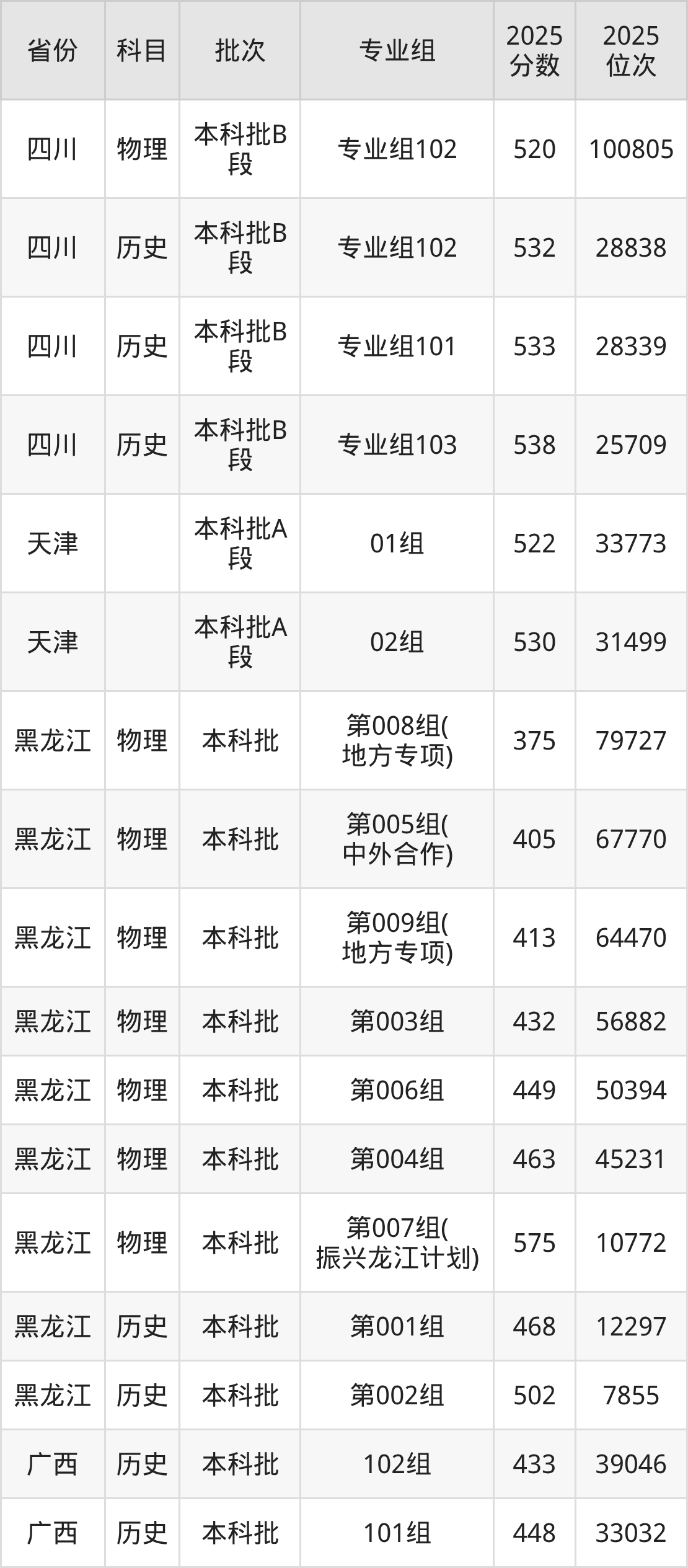 黑龙江科技大学专业组102:2025年投档录取最低分为520分,录取最低位次为100805名。