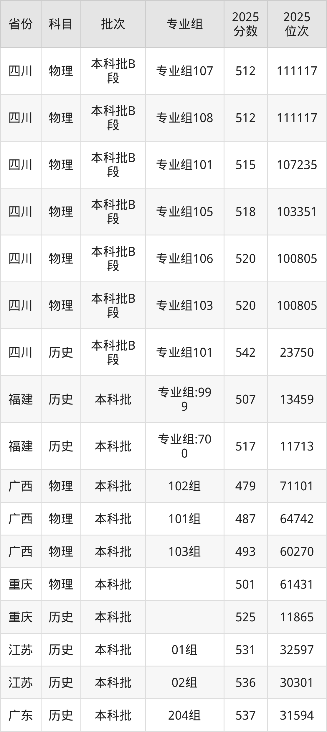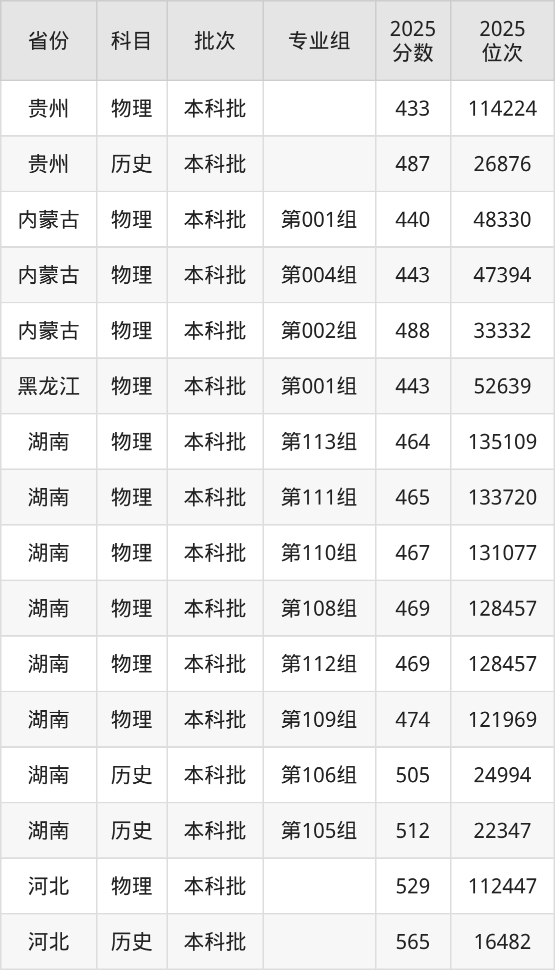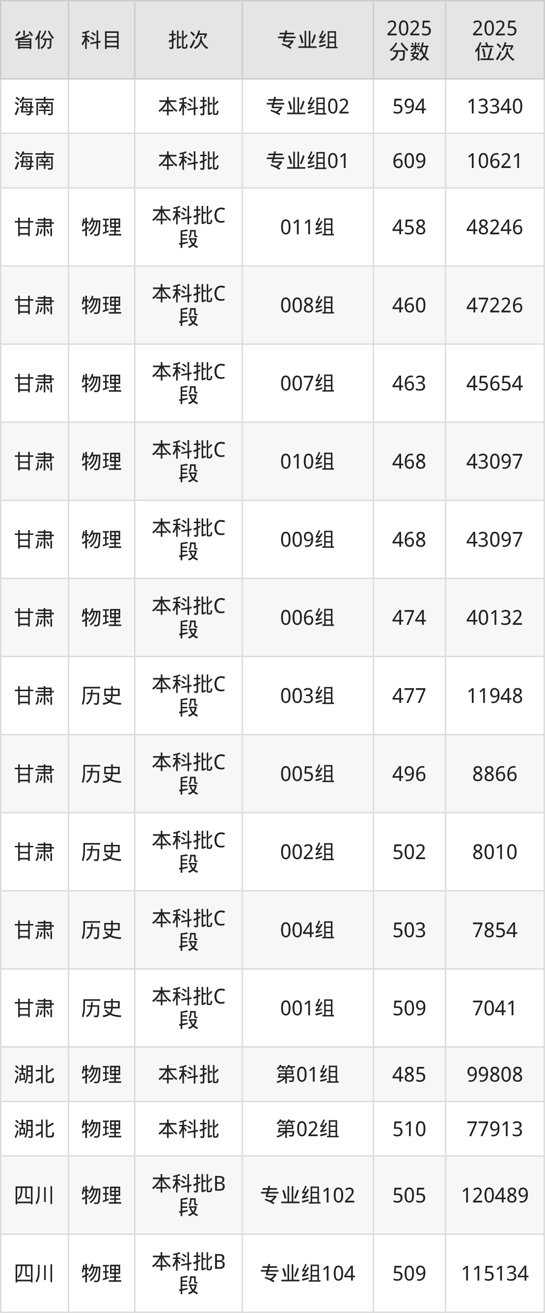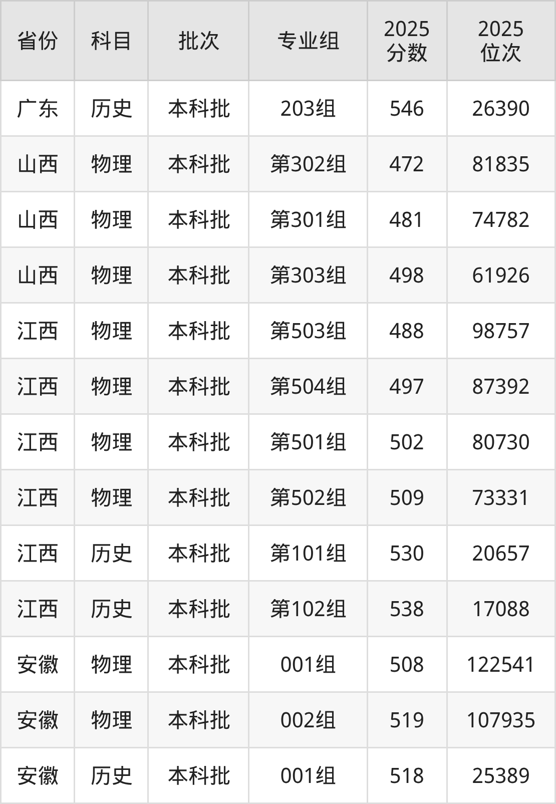 2025年在本科物理类进行招生,各专业组分数线详情如下: