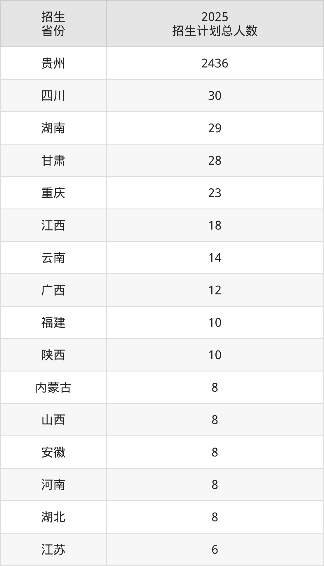 2025年遵义师范学院面向全国20个省市开展本科招生;招生专业共31个,招生人数共2674人。2025年在贵州省招生计划总人数是2436人,其中,遵义师范学院在贵州省招生人数最多的是计算机科学与技术。遵义师范学院在各省具体招生人数情况如下表。