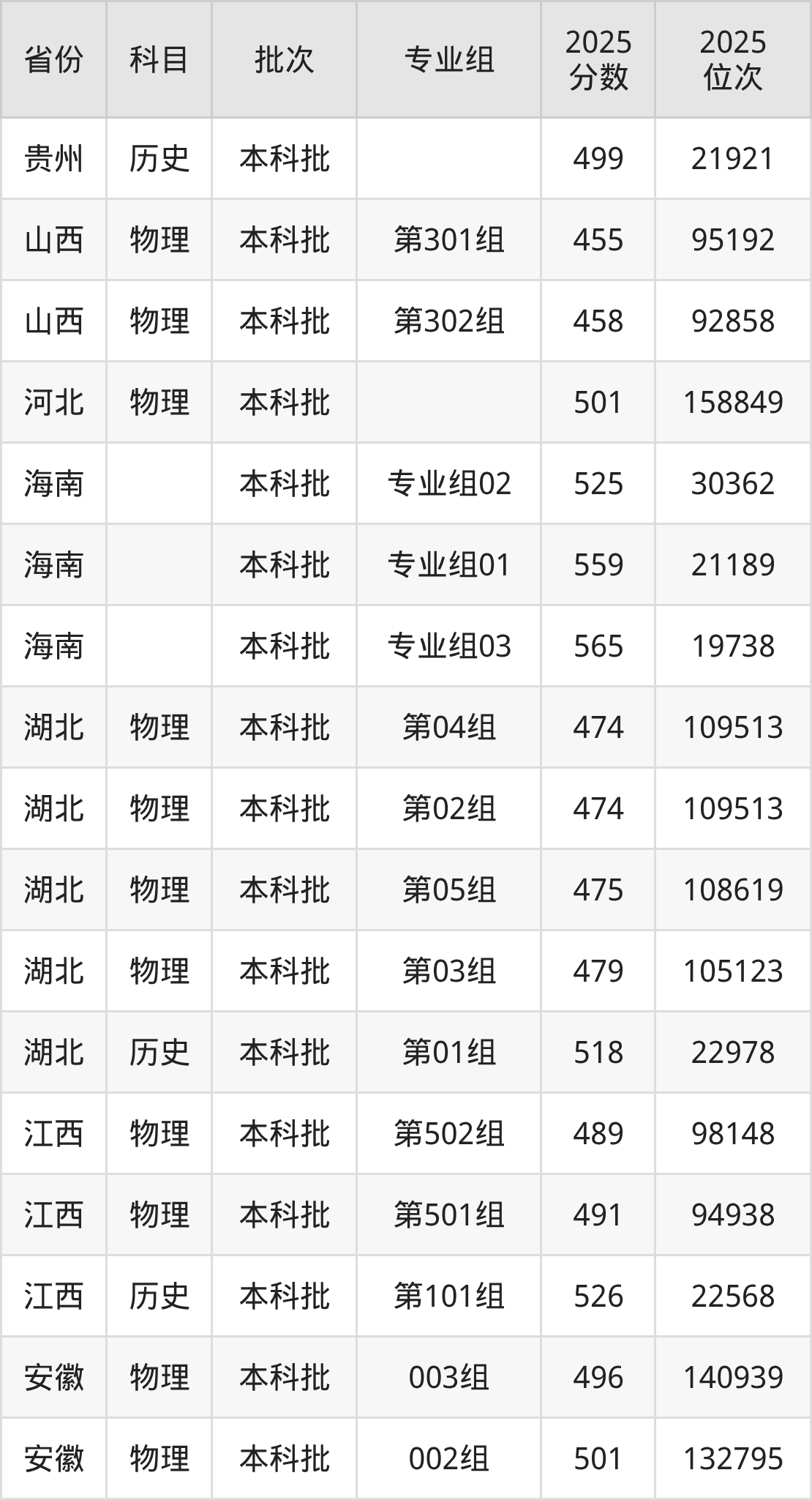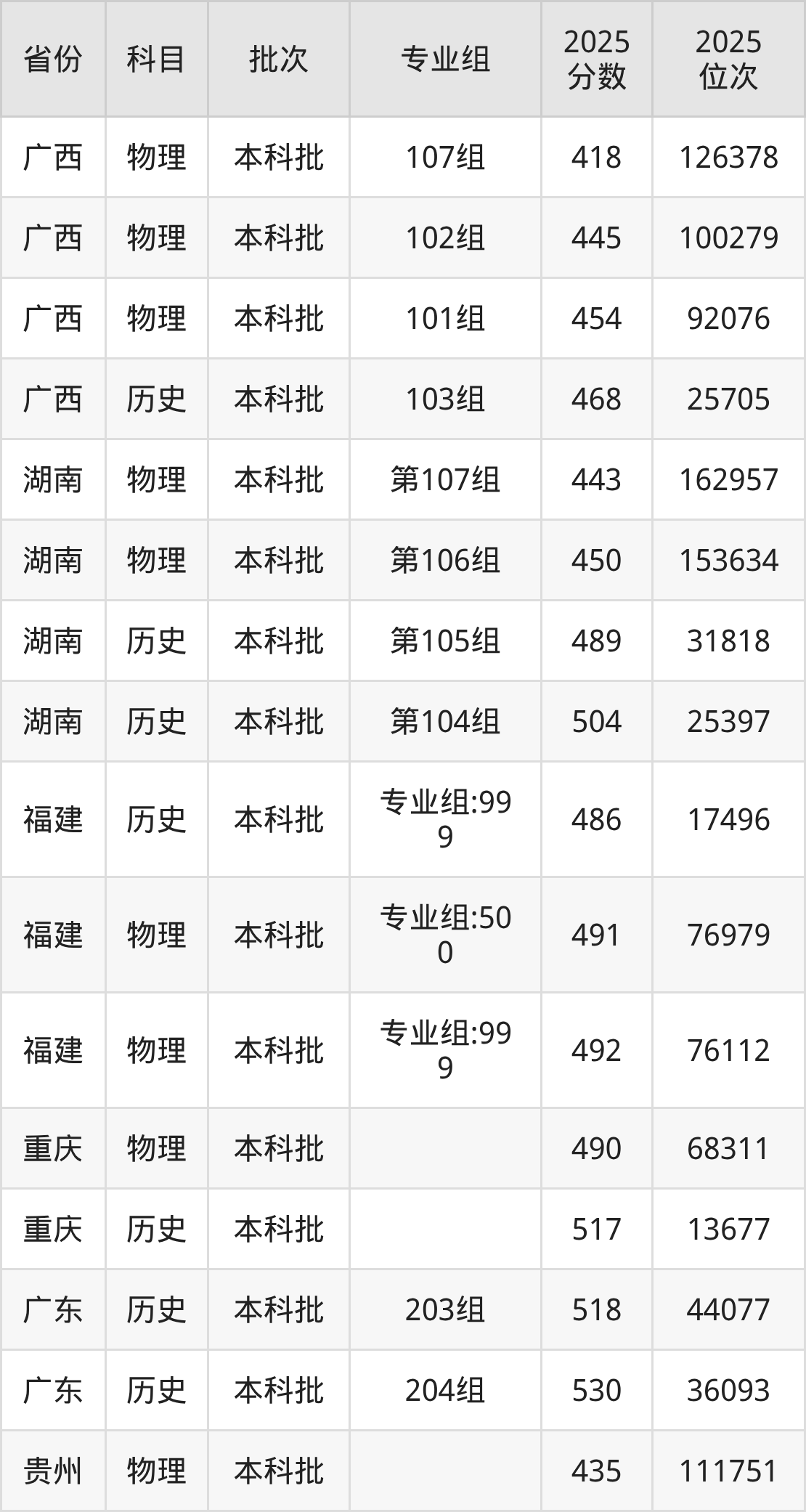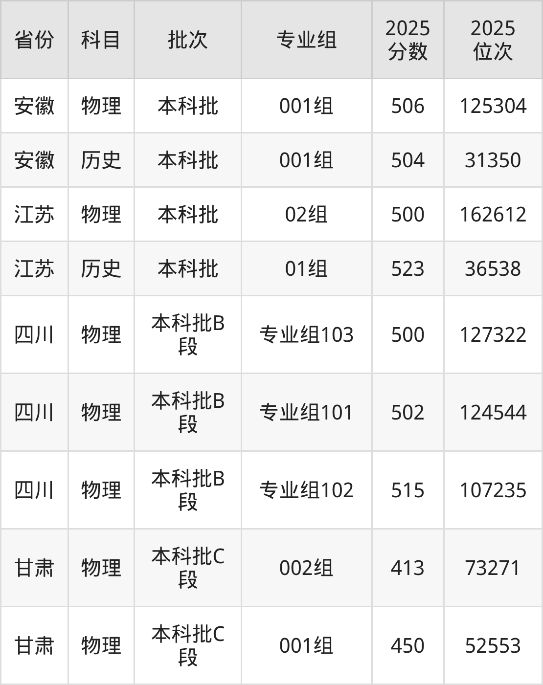 2025年在本科物理类进行招生,各专业组分数线详情如下: