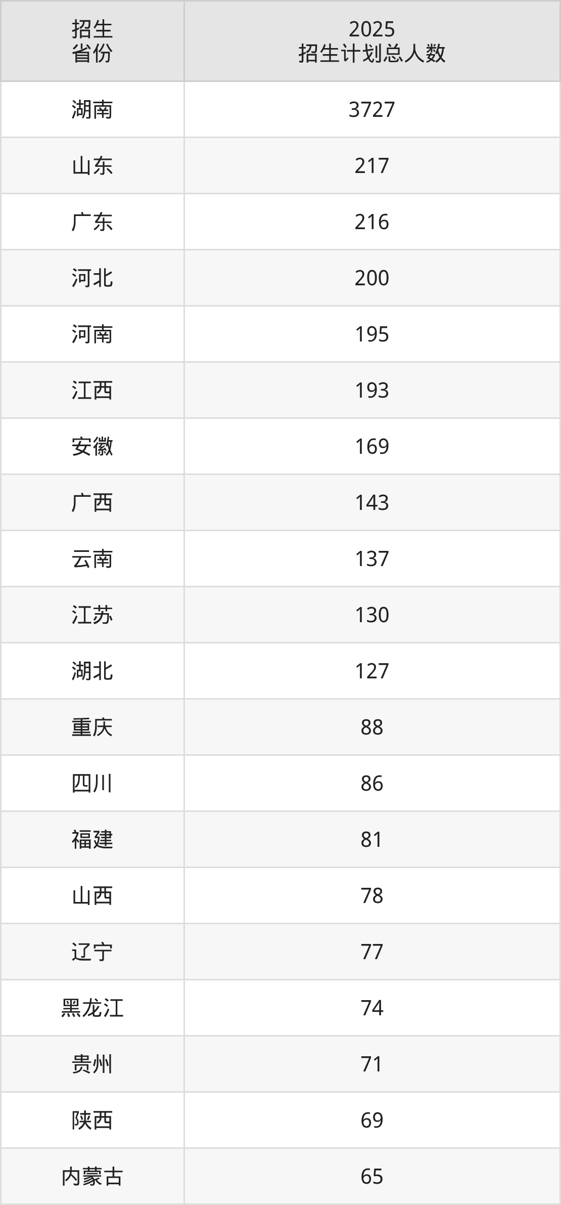 2025年湖南师范大学面向全国29个省市开展本科招生;招生专业共60个,招生人数共6432人。2025年在湖南省招生计划总人数是3727人,其中,湖南师范大学在湖南省招生人数最多的是物理学。湖南师范大学在各省具体招生人数情况如下表。