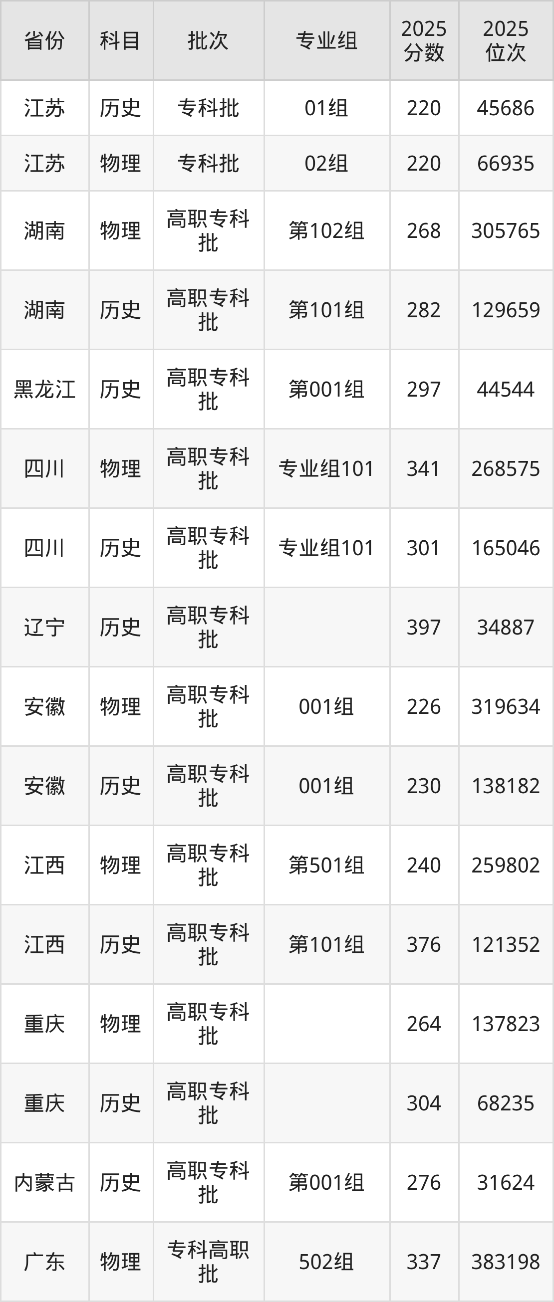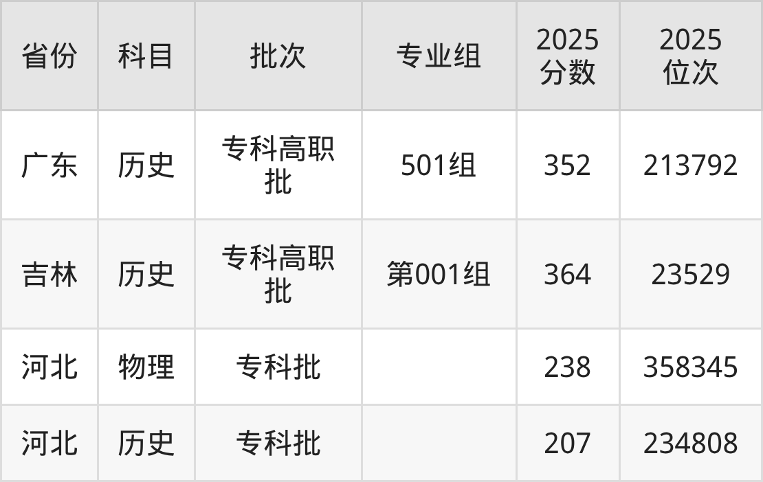 2025年在专科历史类进行招生,各专业组分数线详情如下: