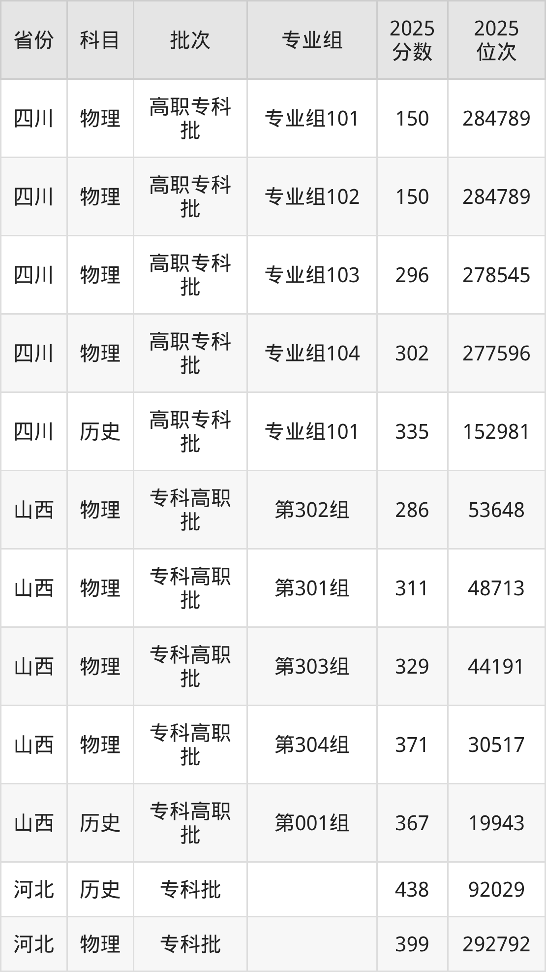 2025年山东城市服务职业学院全国录取分数线是150分到438分,录取最低在四川物理类(专业组101)、录取最高在河北历史类。各省各专业组最低分具有差异,详情如下: