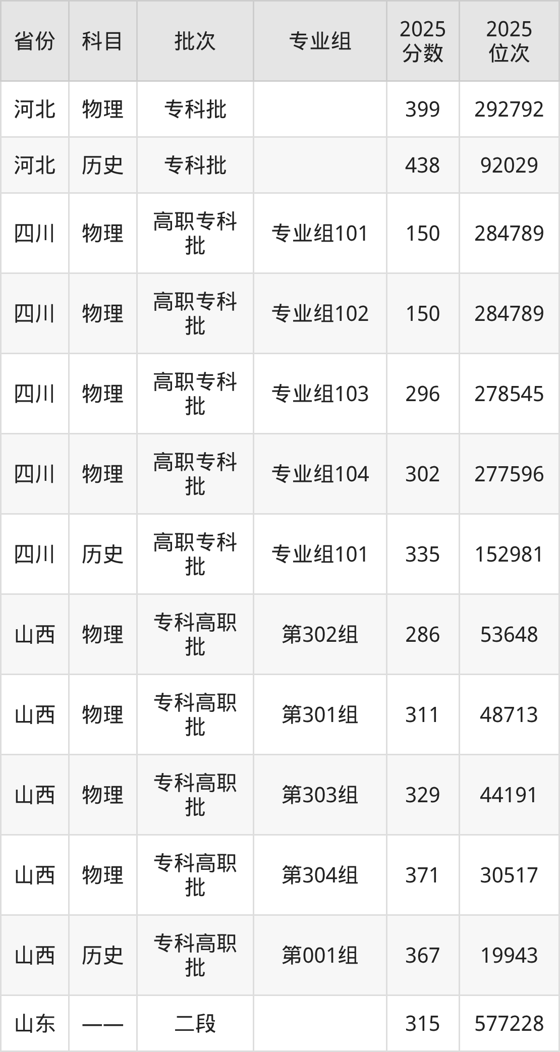 2025年山东城市服务职业学院全国录取分数线是150分到465分,录取最低在四川物理类(专业组101)、录取最高在山东。各省各专业组最低分具有差异,详情如下: