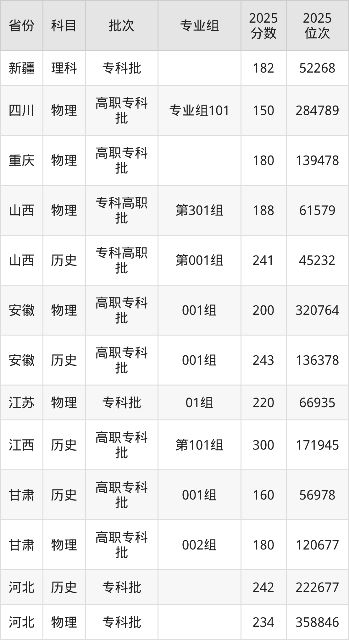 2025年在专科物理类进行招生,各专业组分数线详情如下:
